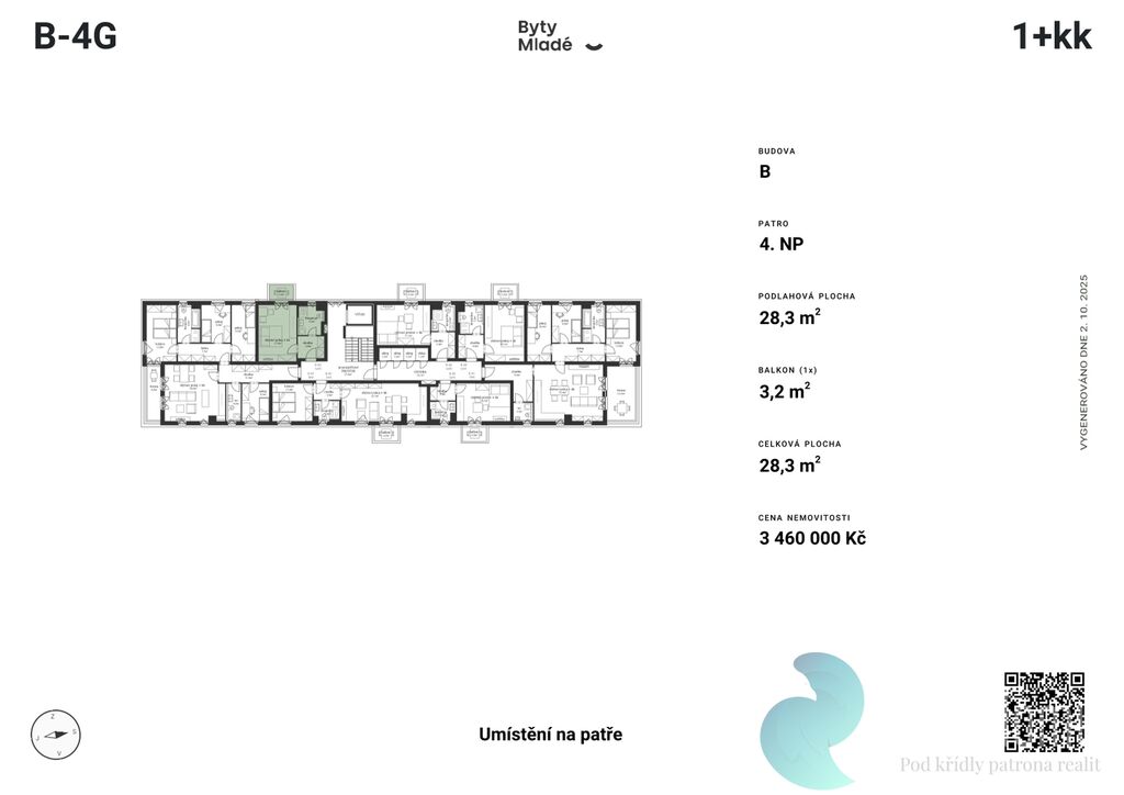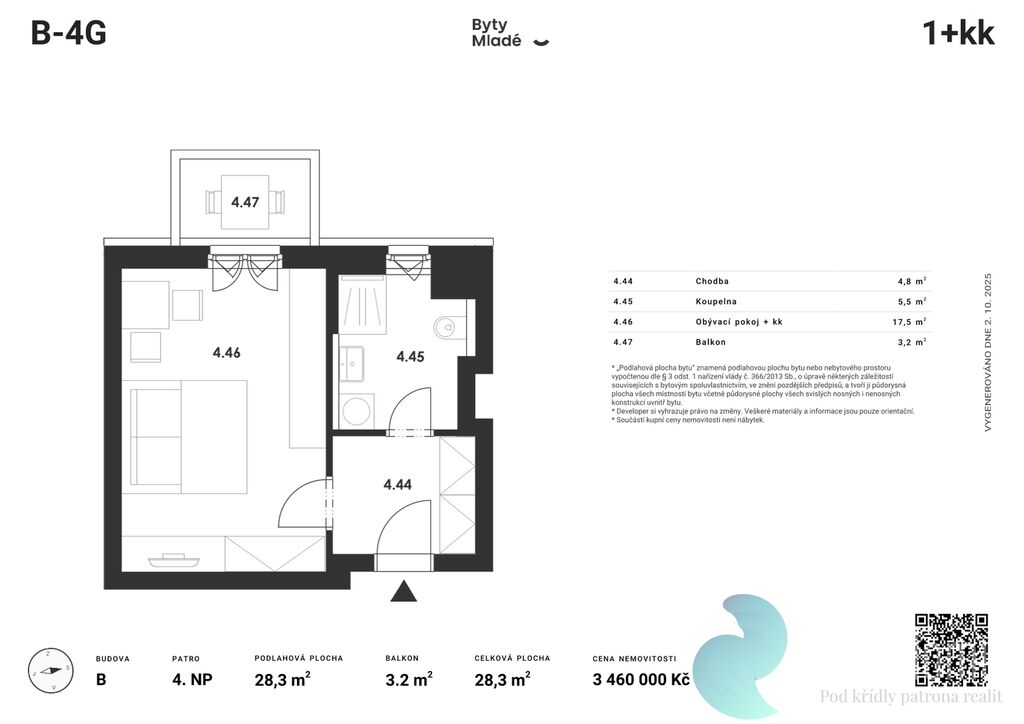 Nabízený byt č. B-4G o dispozici 1+kk, výměře 28,3 m2 a balkonem 3,2 m2, se nachází v prvním patře budovy B. Disponuje vstupní chodbou, koupelnou a obývacím pokojem s kuchyňským koutem.