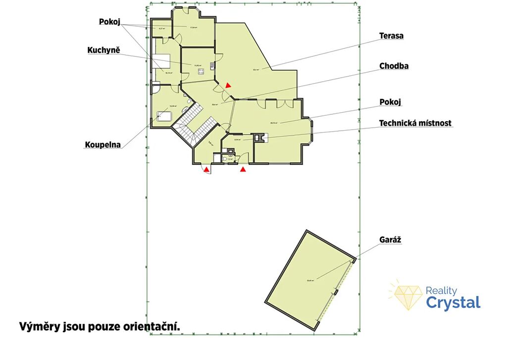 Dům je atypicky řešený, v přízemí se nachází otevřený a velmi prostorný obývací pokoj s krbem, kuchyně s jídelnou, ložnice, šatna, koupelna, WC, technická místnost.