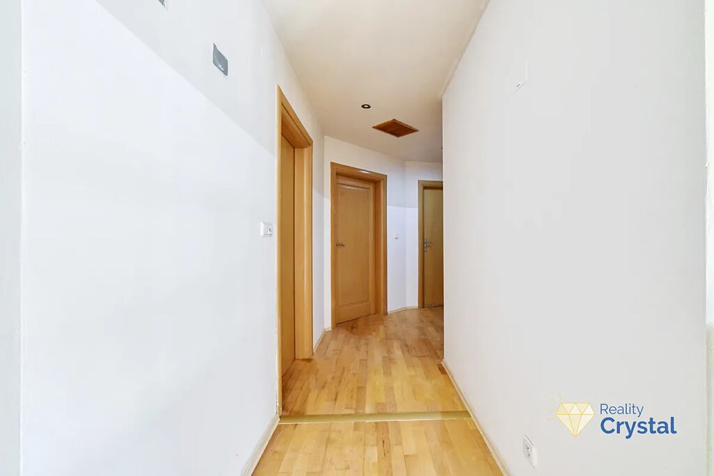 Dřevěným schodištěm se dostaneme do 1. patra a do dalších 4 pokojů a dvou koupelen. Podlahy v domě jsou plovoucí, dřevěné, v koupelná je dlažba.