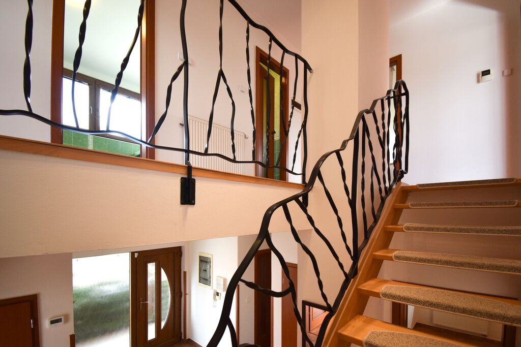 Hlavní obytný prostor začíná prostornou vstupní halou, jejímž hlavním prvkem je točité schodiště s kovaným zábradlím.