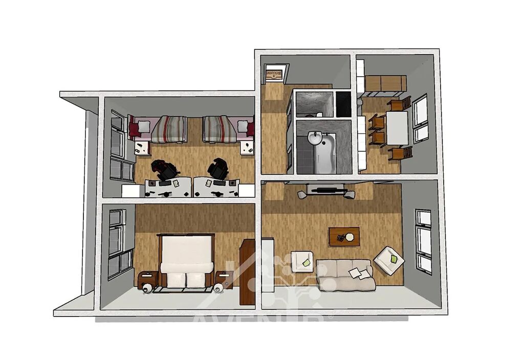 Velkoryse řešená dispozice nabízí dostatek prostoru pro celou rodinu i domácí kancelář. Balkon je orientovaný s výhledem na celé město, je osvětlený a vybaven elektrickou zásuvkou – ideální pro večerní posezení. Balkón je veden přes dva pokoje