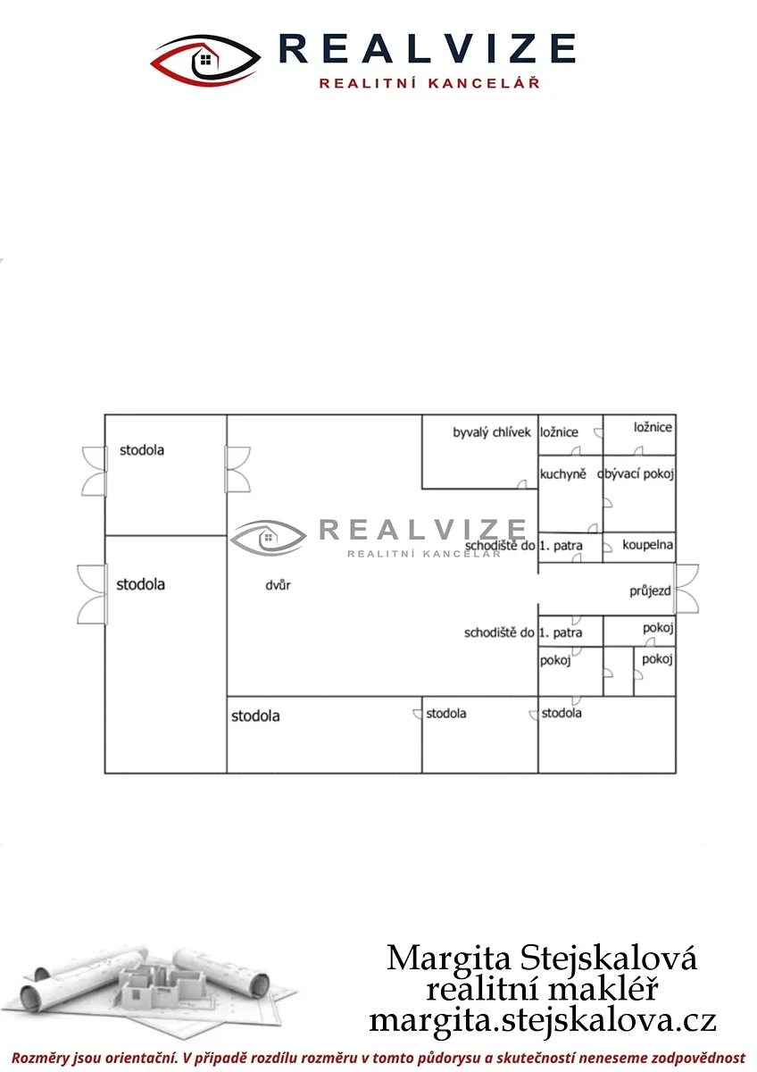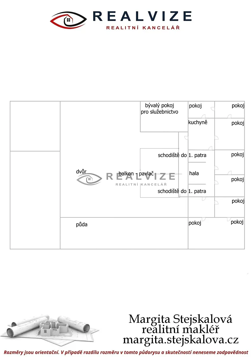 Hlavní stavba - budova je obytná - (částečně podsklepená) a zde se nacházejí pokoje v 1. i ve druhém nadzemním podlaží (viz přiložený plánek) a ve 3. nadzemním podlaží je půda.
