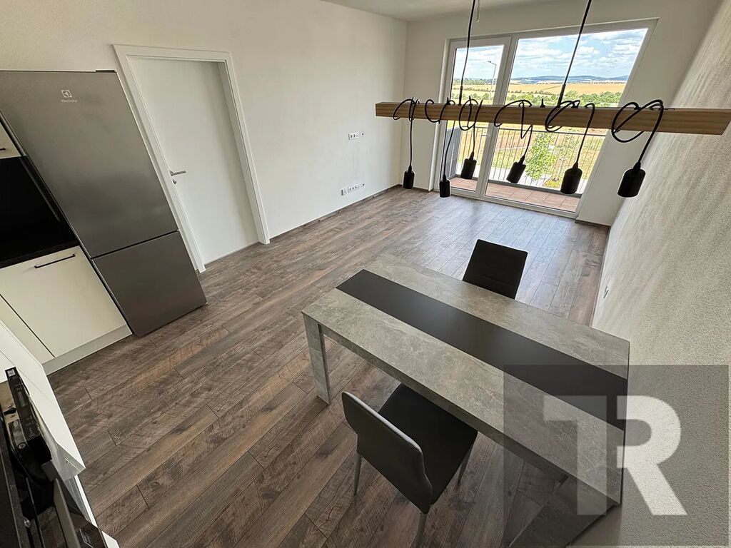 Dispozice: předsíň, obývací pokoj s kuchyňským koutem (sklokeramická varná deska, digestoř, myčka, el. trouba, lednice s mrazákem, jídelní stůl + 4 židle) s výstupem na balkon (orientace na V), ložnice s vestavěnou skříní, koupelna se sprchovým koutem a WC.