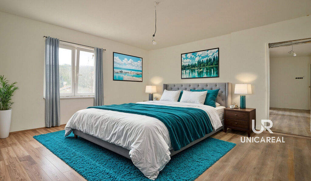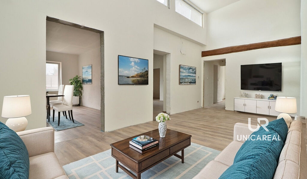 V 1. NP se nachází bytová jednotka 5+kk - 131m² s technickým zázemím a garáží, odkud se centrálním schodištěm dostaneme do 2. NP s dispozicí 2+kk - 68 m² včetně praktické šatny. Dům se dá využít i jako dvougenerační se dvěma samostatnými byty.