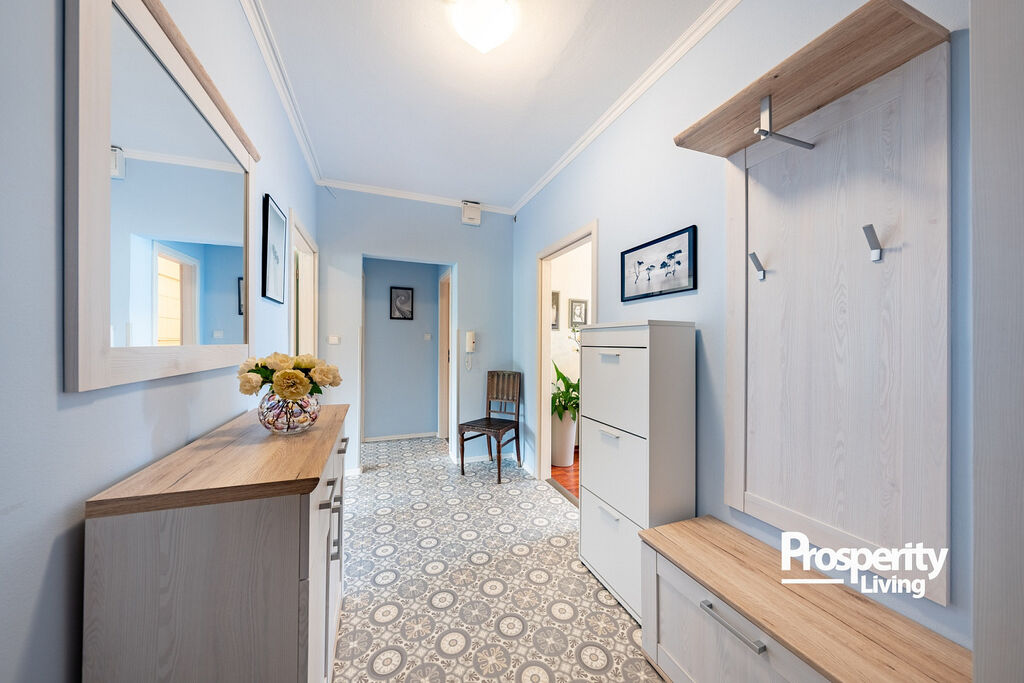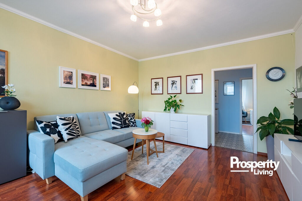 Celková dispozice bytu nabízí prostorný obývací pokoj, samostatnou kuchyni s jídelním koutem, dvě ložnice, předsíň s dostatkem úložných prostor, koupelnu a WC. Kuchyň je vybavena moderní linkou s vestavěnými spotřebiči včetně trouby, digestoře a pračky. Interiér působí svěže a útulně díky kvalitním podlahám, novým dveřím, neutrálním barvám a dostatku denního světla. Byt je částečně zařízený a připravený k okamžitému nastěhování.