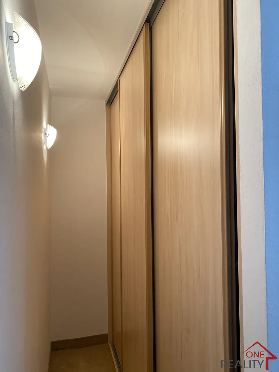 Dispozice bytu: vstupní chodba s vestavěnou skříní, kuchyně s kuchyňskou linkou včetně spotřebičů (sporák, lednice, digestoř) a nádobí, pokoj včetně vybavení, zděná koupelna se sprchovým koutem a pračkou, WC s umyvadlem.