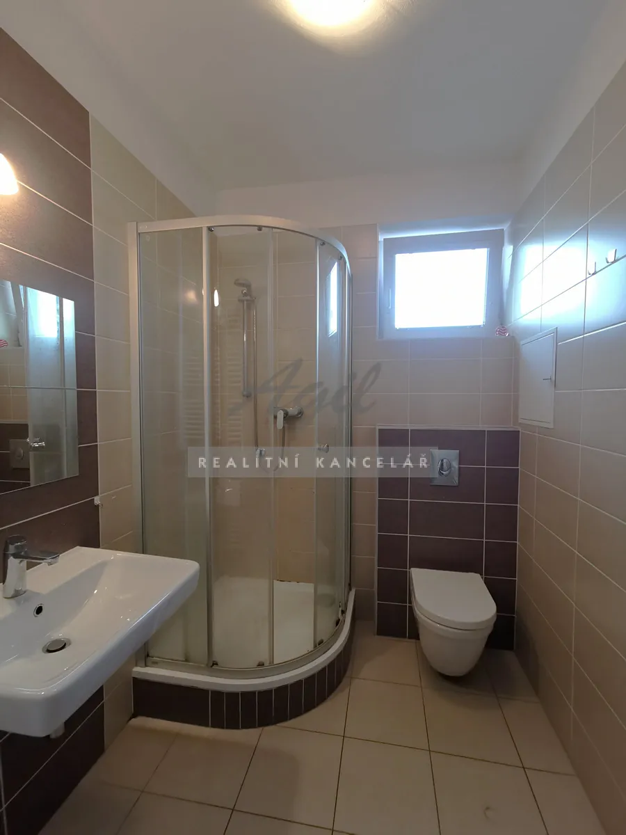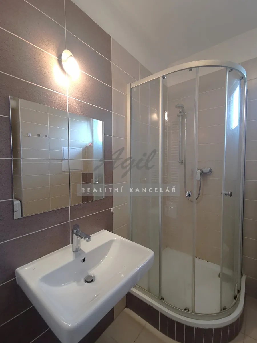 Koupelna – umyvadlo, nástěnné zrcadlo s osvětlením, sprchový kout, WC, přípojka na pračku, pračka, plynový kotel.
