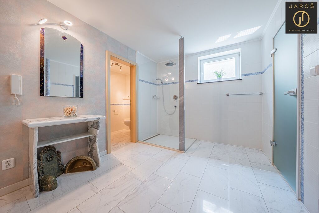 Podzemní podlaží je plně využité pro relaxaci a zábavu. Najdete zde hernu s kulečníkem, stolním tenisem a šipkami, domácí fitko, parní saunu s odpočívárnou, sprchou a samostatnou toaletou, technické zázemí a skladovací místnost s regály. Praktickým detailem je i shoz na prádlo z horní koupelny přímo do sklepa.