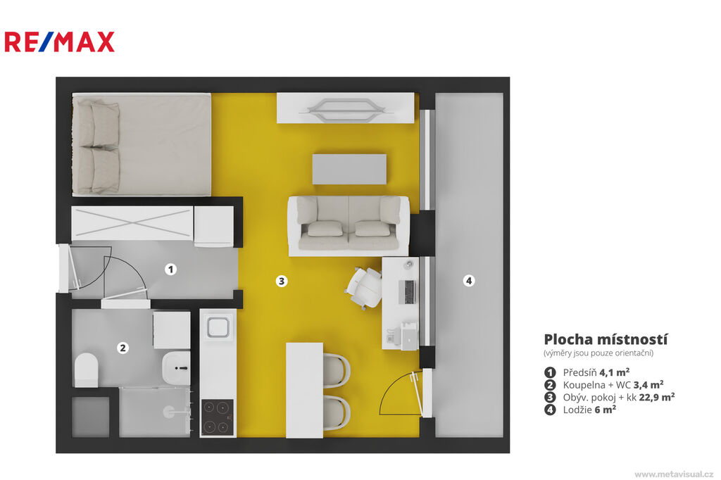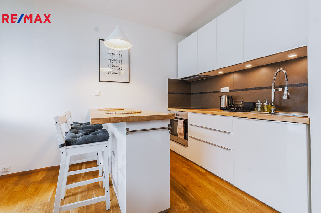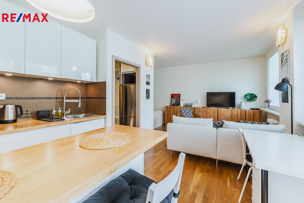 Byt je orientován na jihozápad a je kompletně vybaven. Dispozice bytu zahrnuje obývací pokoj s manželskou postelí, úložným systémem, sedací soupravou a pracovním stolem. Kuchyňský kout je vybaven kuchyňskou linkou, spotřebiči a barovým sezením. V koupelně se nachází sprchový kout, toaleta a pračka. Součástí bytu je také komora a prostorná šatní skříň v předsíni.