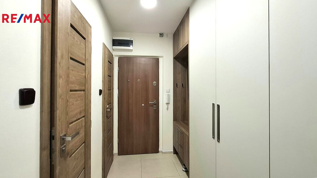 Dispozice bytu nabízí předsíň, obývací pokoj s lodžií, kuchyň, přes kterou se vchází do ložnice, koupelnu a oddělenou toaletu. Kuchyň je vybavena moderní rohovou kuchyňskou linkou, jejíž součástí je myčka nádobí a sporák s indukční varnou deskou a elektrickou troubou. Dostatek úložných prostor zajišťují vestavěné skříně po celé délce předsíně a další vestavěná skříň umístěna v ložnici. Byt působí světlým a vzdušným dojmem.