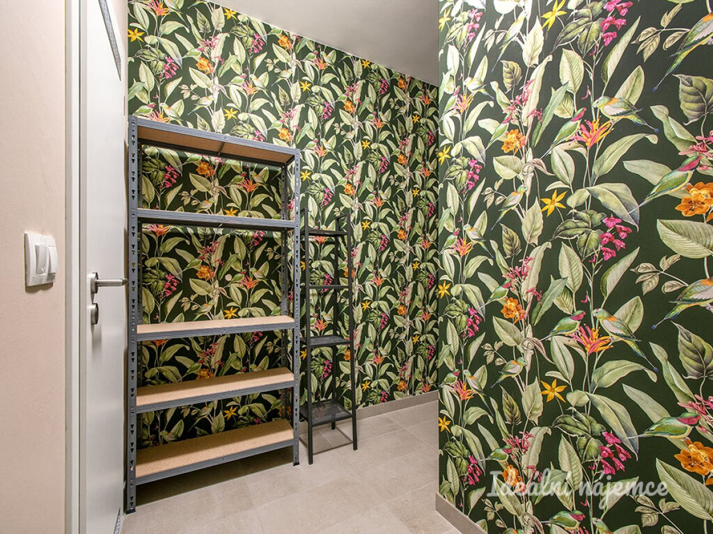 Byt se nabízí částečně vybavený (viz. fotogalerie), přičemž záleží na domluvě s majiteli, jaké vybavení v byte zůstane. Moderní kuchyňská linka disponuje lednicí, myčkou, elektrickou troubou, varnou deskou, mikrovlnnou troubou a digestoří. V ložnici je prostorná šatna. Dále je v bytě komora, která nabízí dostatek úložného prostoru. V koupelně je pračka. Obyvatelé domu mohou využívat společnou střešní terasu s panoramatickým výhledem do okolí.