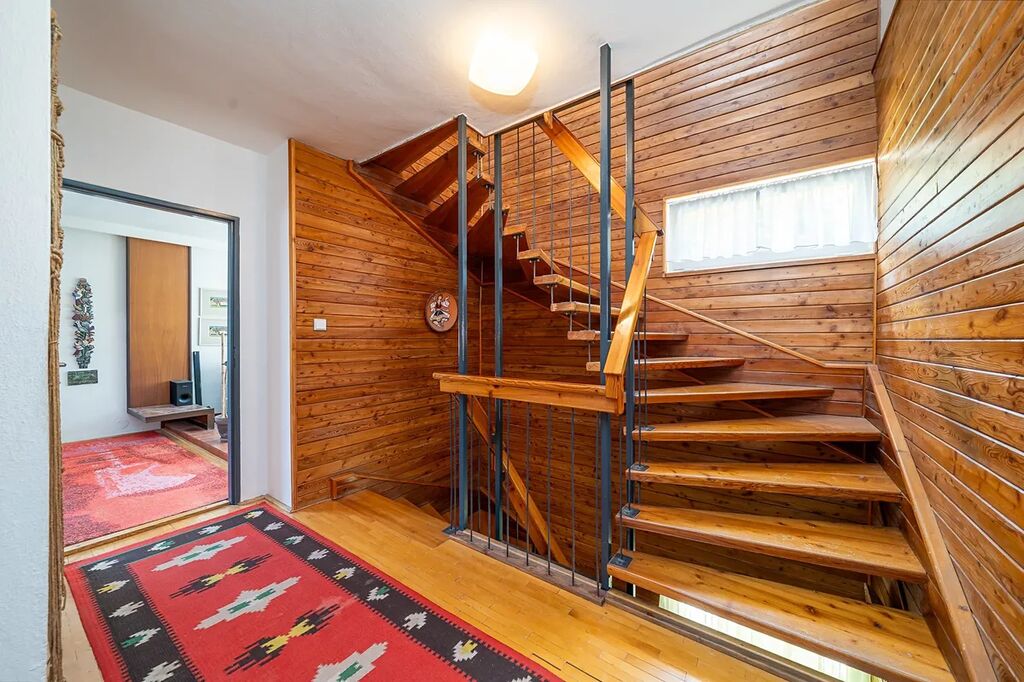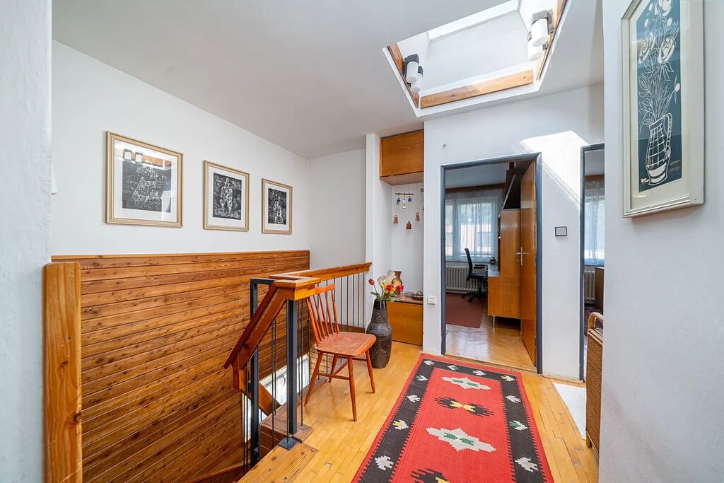 První patro má dispozici 2 + 1 (obývací pokoj, jídelna, kuchyně), dva balkóny a krb. Sociální zázemí tvoří koupelna se sprchovým koutem a WC. Ve druhém patře s dispozicí 4+0 najdete dva dětské pokoje, pracovnu a ložnici. Dále koupelnu s vanou a WC. Z ložnice je vstup na balkón. Z něj přístup na střechu.