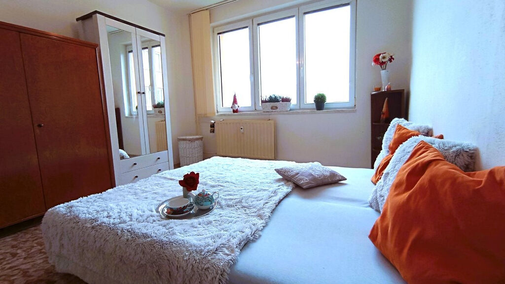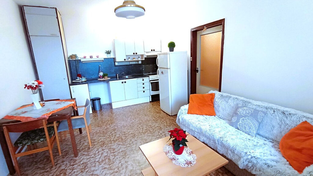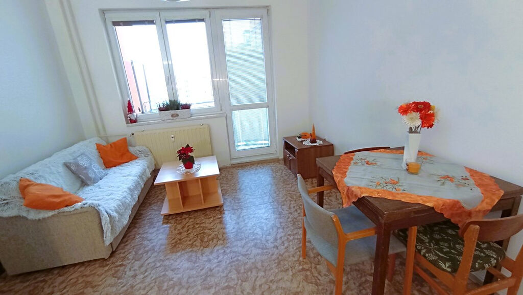 Nabízíme dlouhodobý pronájem bytu 2+kk s balkonem v panelovém domě v klidné části sídliště Máj. Byt o celkové rozloze 42 m2 se nachází v 5 patře celkem z 8 pater. Byt je plně vybavený včetně spotřebičů. Po vstupu do bytu se ocitneme v předsíni, kde jsou k dispozici 2 vestavné skříně a věšák. V ložnici je manželská postel, komoda a dvě skříně. Na okně jsou vertikální žaluzie. Kuchyň je spojena s obývacím koutem, kde je rozkládací gauč konferenční stolek a TV stolek. Dále zde nalezneme rozkládací jídelní stůl se židlemi. Kuchyň je vybavena linkou s potravinovou skříní, sklokeramickým sporákem, digestoří a lednicí s mrazákem. Je zde také vstup na balkon s výhledem do klidného vnitrobloku. V koupelně je sprchový kout, umyvadlo se zrcadlovou skříňkou a pračka. K bytu dále náleží 2 sklepy v přízemí domu.