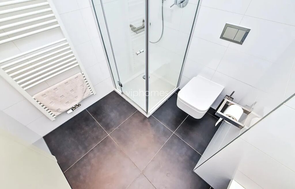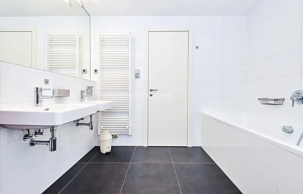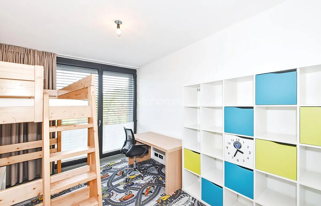 Samotný byt poskytuje ojedinělé bydlení s neobyčejnou dispozicí. Elegantní oddělení zóny obytné a relaxační zajišťuje uživatelům klid a zároveň plné využití obytného prostoru, včetně venkovní terasy v době denní aktivity. Hlavní obytný prostor je spojen s kuchyní, jídelním koutem; velké dveřní okno se vstupem na terasu poskytuje dostatek slunečního svitu. V zimních měsících je zde i domácí lihový krb. Kuchyňská linka je vybavena elektrickými spotřebiči moderního typu. K dispozici jsou 3 samostatné ložnice, 2 designové koupelny – jedna s vanou i sprchovým koutem, druhá se sprchovým koutem. Dále je zde velká prostorná chodba s dostatečným úložným prostorem, místností na pračku a sušičku a WC pro hosty. Hlavní ložnice se vstupem na terasu, šatnou a prostornou koupelnou s WC je orientována na jihozápad. K bytu náleží intimní 45m2 terasa s nádherným výhledem do okolí, orientovaná na jihovýchod. Sklep o velikosti 5 m2 se nachází v 2.patře nikoliv v suterénu domu. Dvě parkovací stání. Ve všech prostorách domu jsou bezpečnostní kamery. Zálohy na elektrickou energii jsou 2.940 KČ.