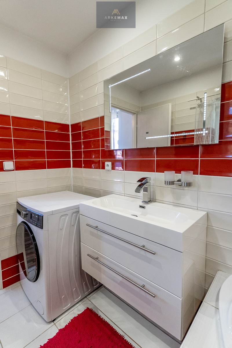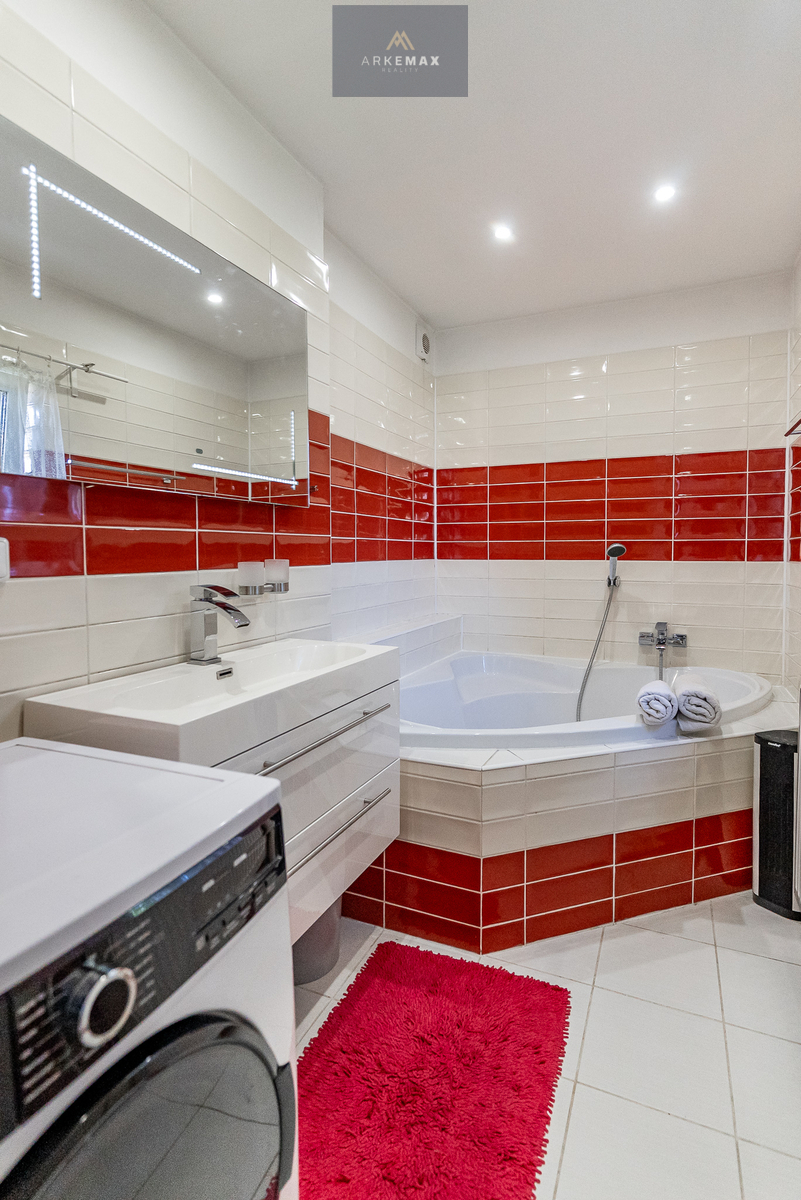 Z tohoto pokoje se dostanete na balkon, kde uvidíte celou zahradu za domem a les. Dále do obývacího pokoje spojeného s kuchyní o velikosti úctyhodných 28,5 m2. Z obýváku pak do ložnice o velikosti 13,5 m2 a s oknem orientovaným na jih. Dále přes chodbičku do koupelny a samostatného WC. Koupelna má plochu 5 m2 a je vybavena rohovou vanou.