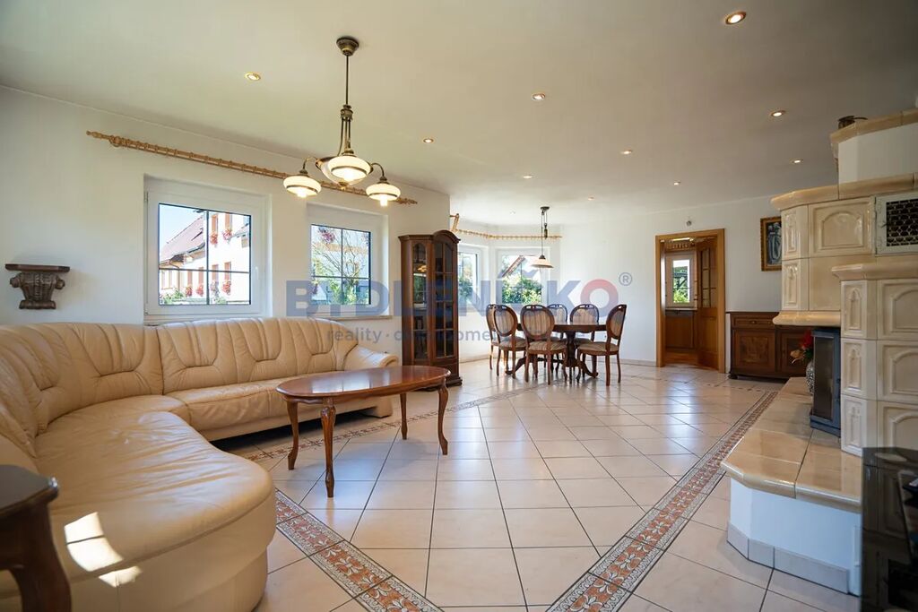 Vstup hlavním vchodem do předsíně, odkud vede chodba se schodištěm do patra. Vpravo se nachází vstup do prostorného obývacího pokoje s kachlovými kamny, která jsou napojena na rozvod tepla do ostatních místností. Z obývacího pokoje je přímý vstup na terasu a do okrasné části zahrady.