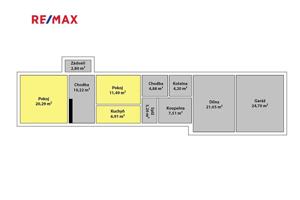 Dispozice zahrnuje obývací pokoj 20,29 m², kuchyň 6,91 m² a spíž 3,26 m² pro uskladnění potravin, dva pokoje 11,49 m² a 10,22 m², koupelnu s WC 7.51 m² a kotelnu 4,20 m². Součástí domu je prostorná garáž 24,05 m² pro pohodlné parkování automobilu a praktická dílna 21,05 m² pro kutily nebo uskladnění nářadí.