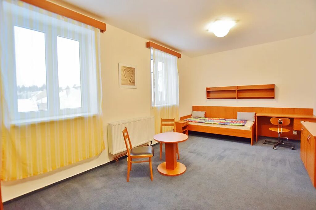 • pokoj vybavený postelí, stolem se židlemi, šatní skříní a komodou