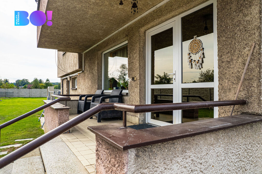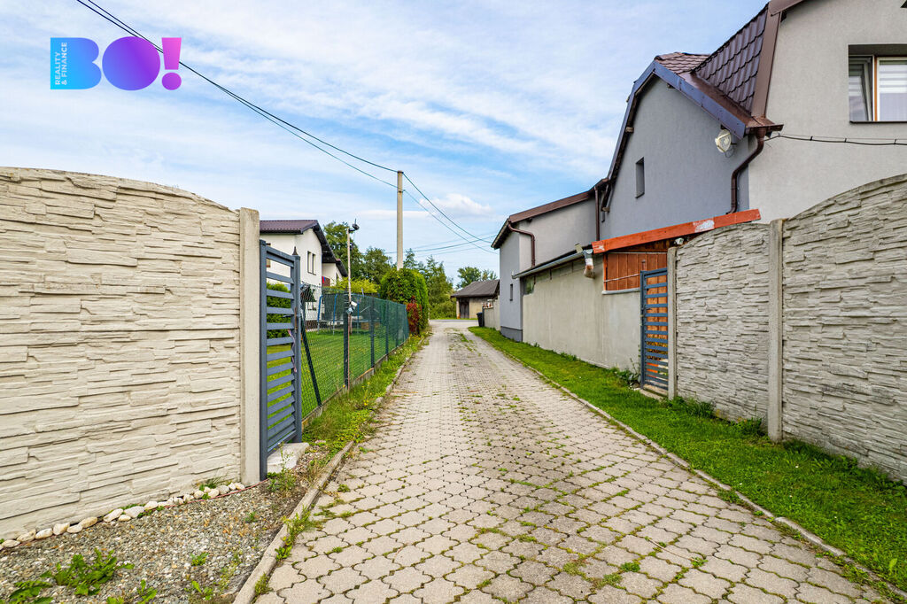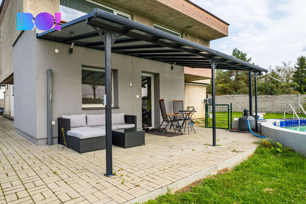 Dům je situován na oploceném pozemku s elektrickou příjezdovou branou na dálkové ovládání a betonovým plotem, který zajišťuje maximální soukromí. Součástí je prostorná zahrada o velikosti přibližně 1 000 m², která nabízí příjemné posezení a velký bazénem s elektrickým osvětlením a kompletním příslušenstvím.