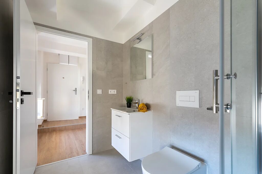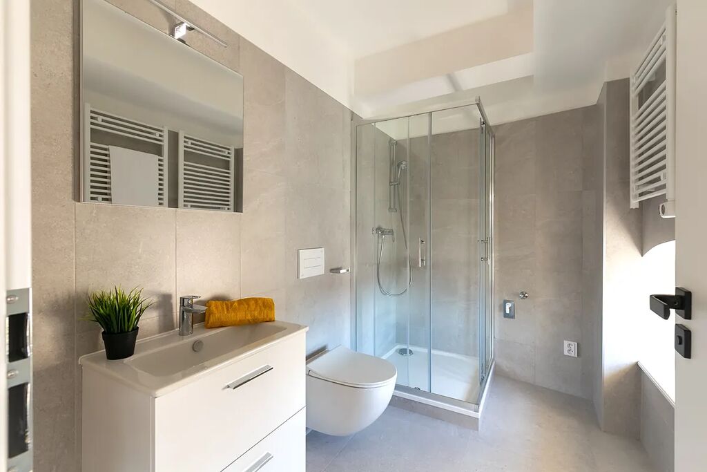 Koupelna je moderně řešená se sprchovým koutem a toaletou.