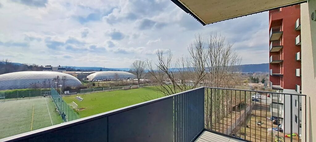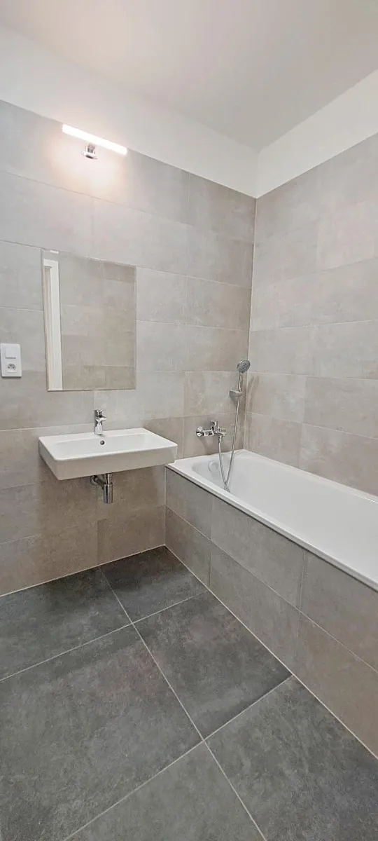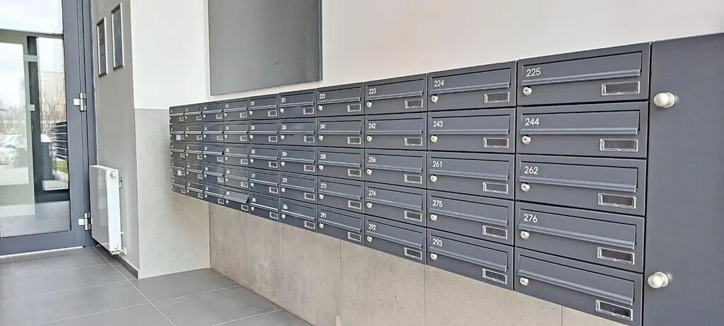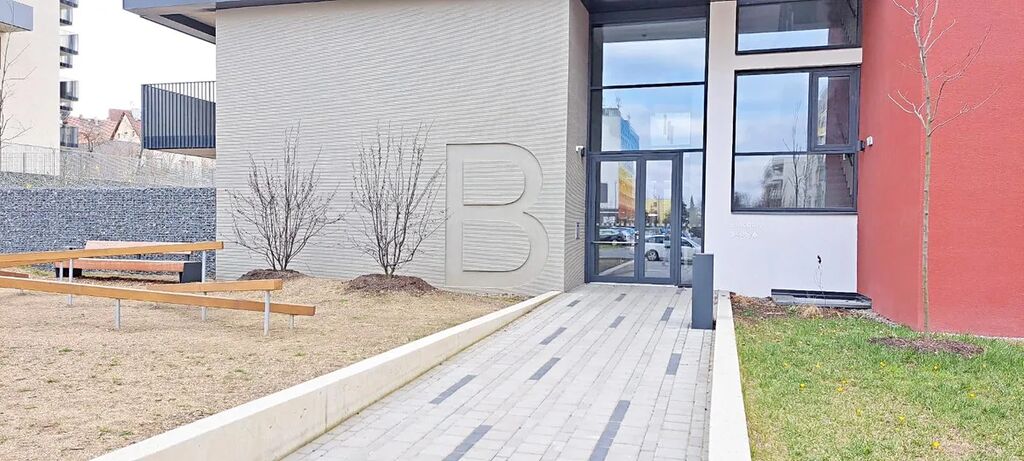 Hezký slunný byt (B242) s výhledem na sportoviště a okolní rezidenční zástavbu. Při vstupu do bytu se nachází velká předsíň s šatní skříní, z ní je pak vstup do koupelny s WC. Obývací pokoj je vybaven kuchyňskou linkou (Gorenje) vč. spotřebičů, z obývacího / pokoje vstup na velký balkon.