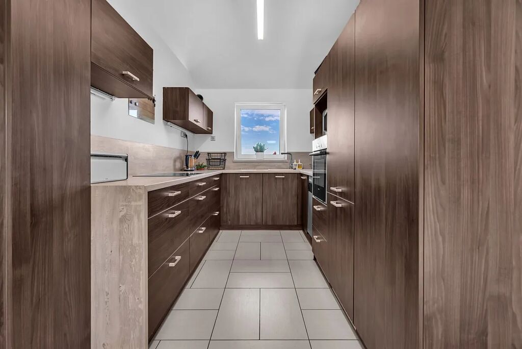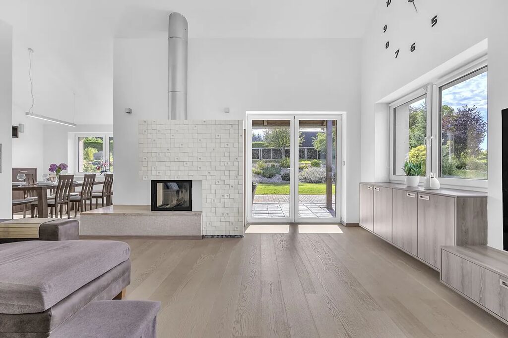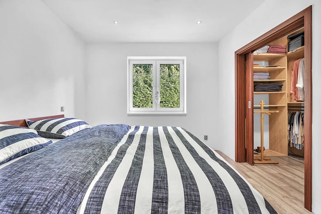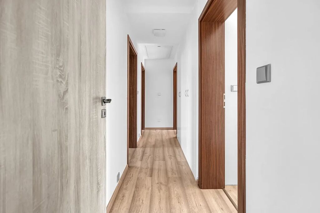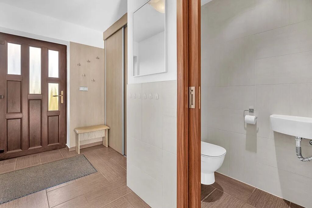 Dispozice - vstupní chodba s úložnými prostory na míru, samostatné WC s umyvadlem, centrální prostor se vstupem na terasu je rozdělen na obývací část, jídelnu a kuchyň, 2 dětské pokoje se vstupem do zahrady, ložnice s šatnou, koupelna s vanou, sprchovým koutem a WC.