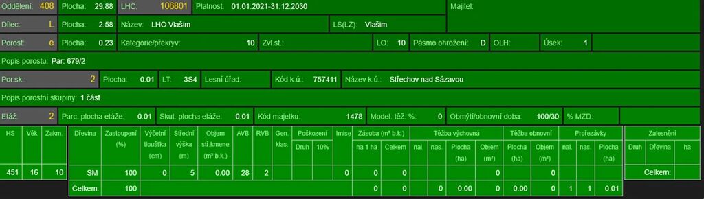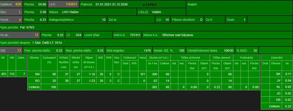 - p.č. 679/2 o celkové výměře 2 357 m2 vedená jako lesní pozemek (stáří lesa 116 let - zastoupení dřevin je smrk, borovice, stáří lesa 20 let - smrk)