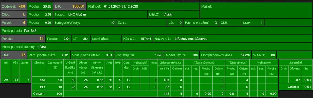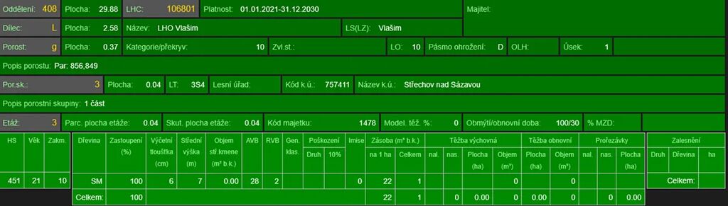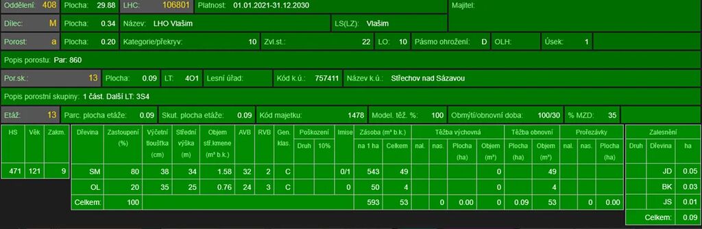 - p.č. 664/2 o celkové výměře 886 m2 vedená jako lesní pozemek (stáří lesa 139 let - zastoupení dřevin je borovice, modřín)