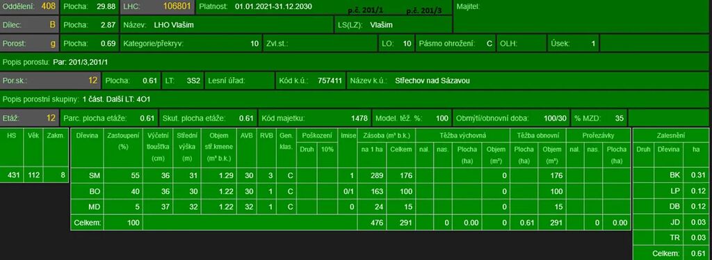 - p.č. 201/1 o celkové výměře 4 496 m2 vedená jako lesní pozemek (stáří lesa 116 let - zastoupení dřevin je smrk, borovice, modřín) - část lesa zasažen kůrovcem (1/4), zbytek lesa je zdravý,