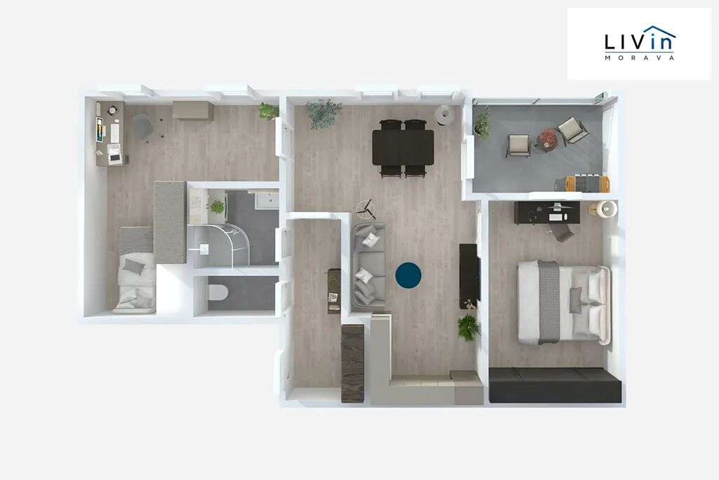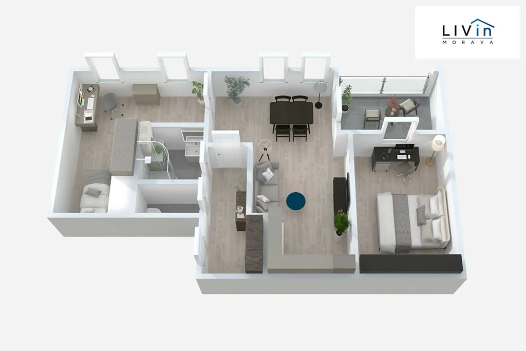Byt je složen z chodby, obývacího pokoje s kuchyní, ložnice, pracovny/dětského pokoje, koupelny, samostatného WC a terasy.