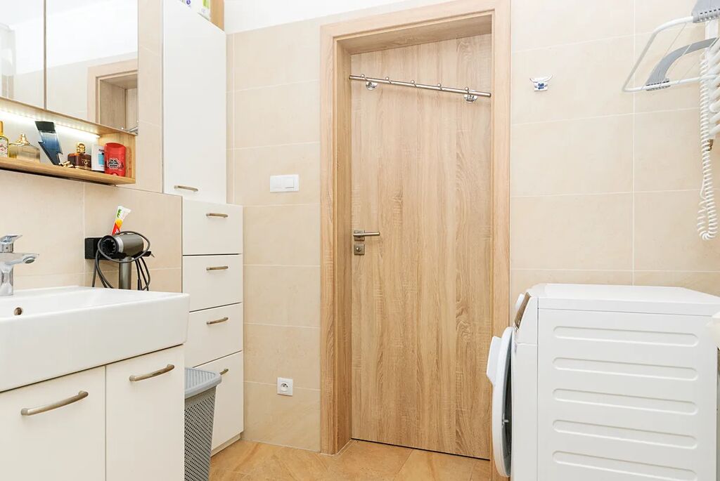 Ložnice (16,2 m²) je zařízena manželskou postelí a šatní skříní. V předsíni se nachází velká vestavěná skříň na míru, která poskytuje spoustu úložného prostoru. Koupelna (5,2 m²) je vybavena vanou, umyvadlem a toaletou. K bytu náleží také sklep (1,9 m²) a vlastní parkovací stání v podzemní garáži.