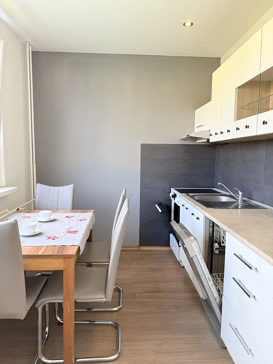 V kuchyni je kuchyňská linka s myčkou, elektrický sporák, stůl a židle.