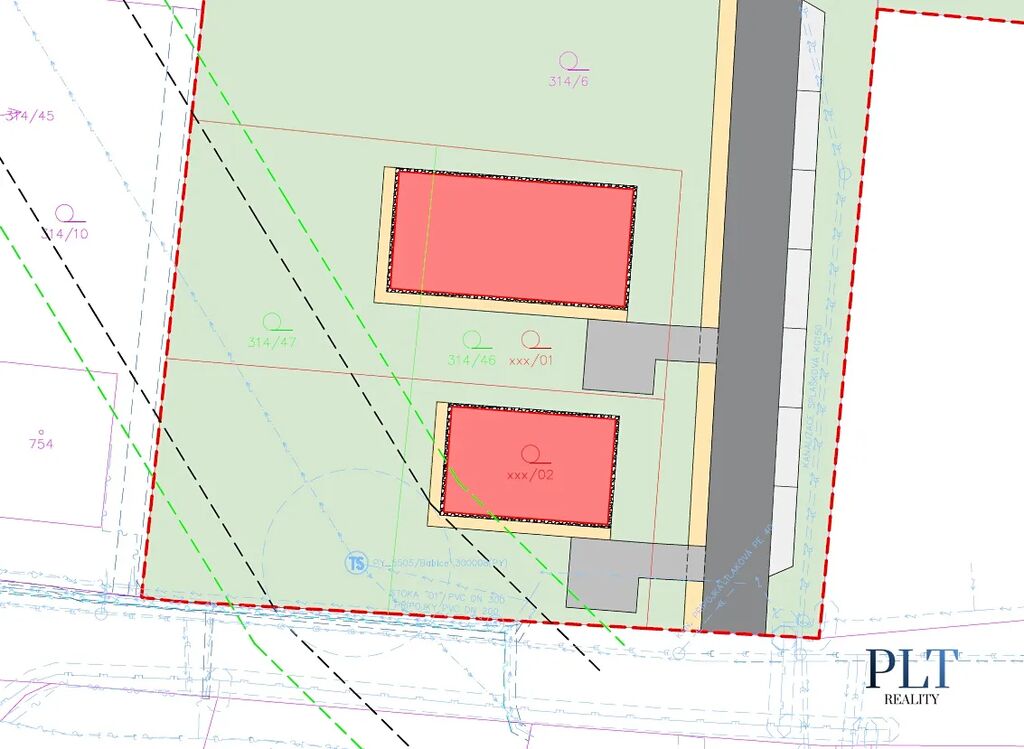 *Poznámka: Část obou pozemků je pod ochranným pásmem elektrického vedení VN – v této zóně nelze umisťovat žádné stavební objekty, bazény ani parkovací stání.*