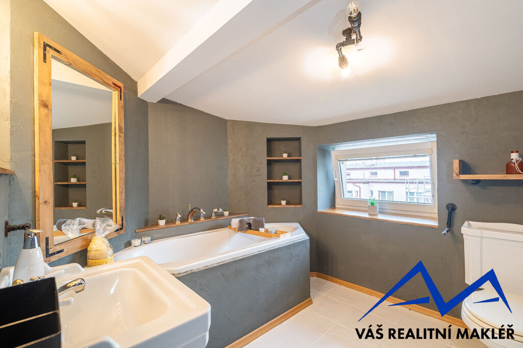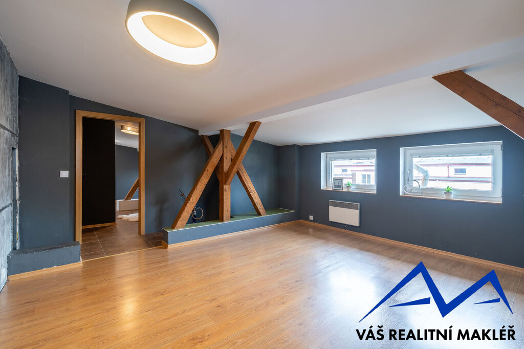 2. patro bytu - obývací pokoj, koupelna s vanou a WC, ložnice, šatna, 2x pokoj, 2x půdní prostor.