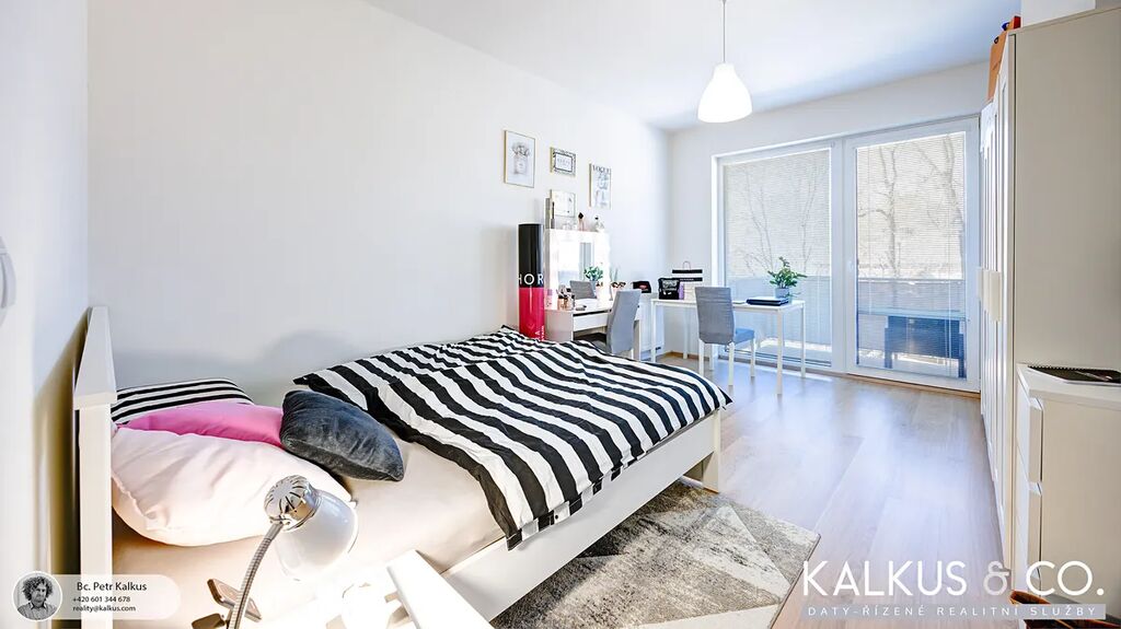 Kuchyňská linka je vybavena vestavěnými spotřebiči (myčka, lednice s mrazákem, horkovzdušná trouba a sklokeramická varná deska). Koupelna disponuje sprchovým koutem, WC a prostorem pro pračku/sušičku. Všechny místnosti jsou přístupné z centrální předsíně, včetně praktické šatny/komory. V celém bytě jsou laminátové podlahy, v předsíni a koupelně je položena dlažba. Na osvětleném balkónu je vyvedena zásuvka na 220V a prostor pro venkovní nábytek.
