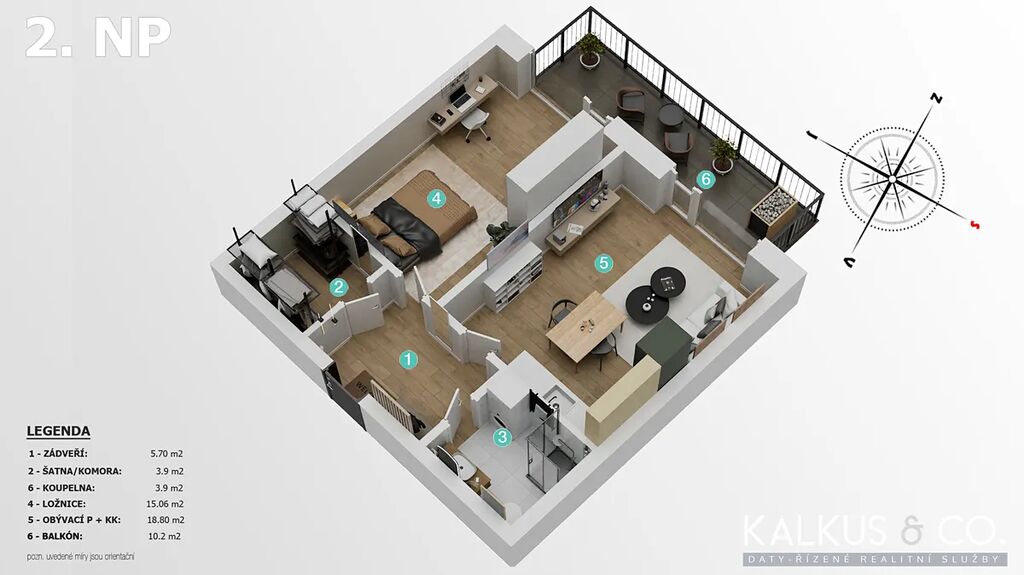Funkční 3zóna kuchyně-jídelna-obývací pokoj je – stejně jako ložnice – propojena velkoformátovými okny a dveřmi s balkónem o výměře 10 m². Oba pokoje k tomu nabízí nezastavěné výhledy do údolí Kněživky se vzrostlými stromy.