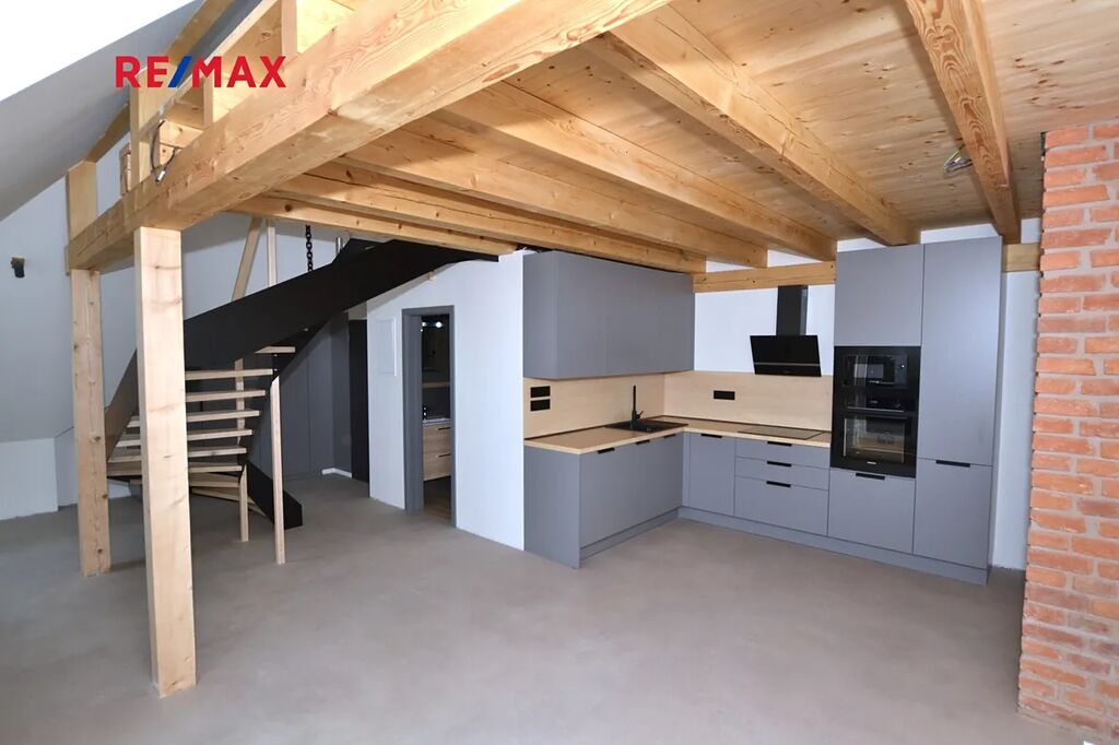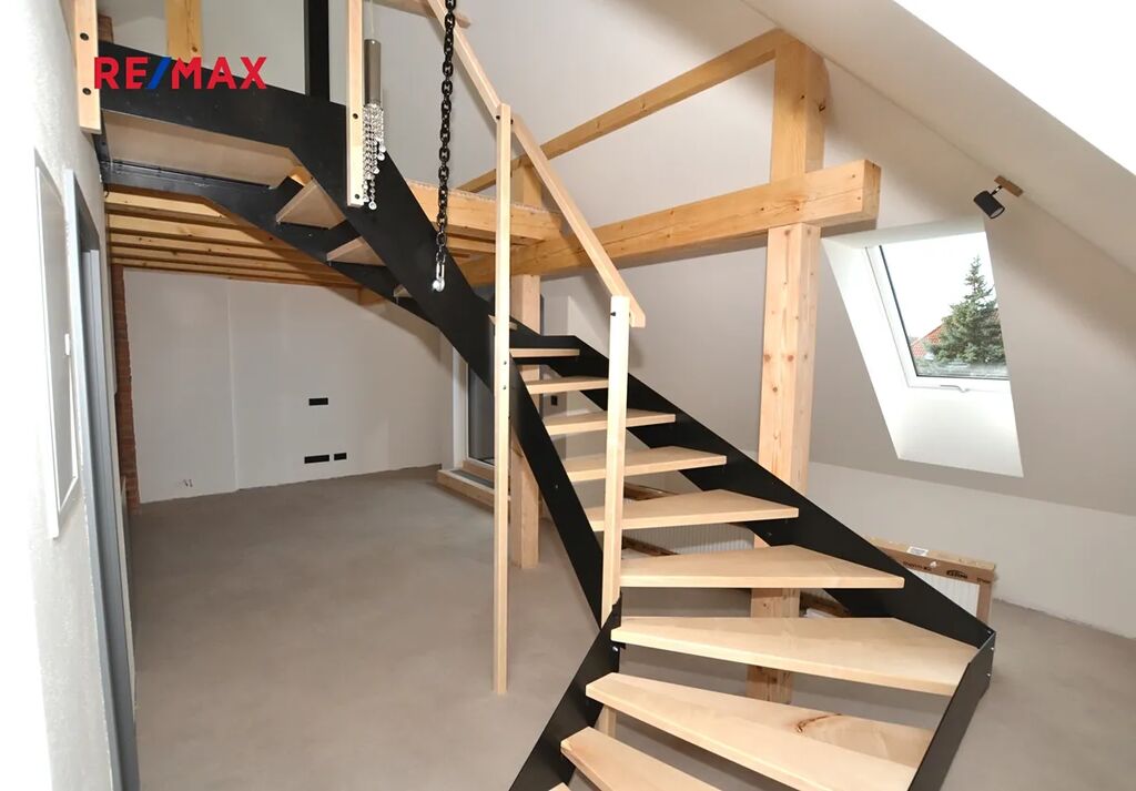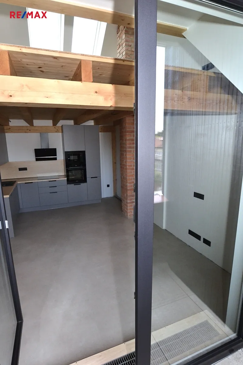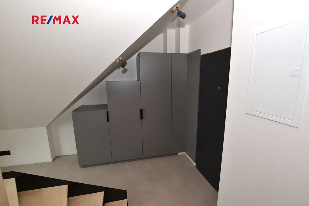 Byt čeká na svého prvního nájemce. Okna obývacího pokoje s lodžií jsou orientována na západní stranu, střešní okna ložnice jsou orientována na východní stranu do zahrady se vzrostlými stromy, kterou nájemce může využívat k relaxaci.