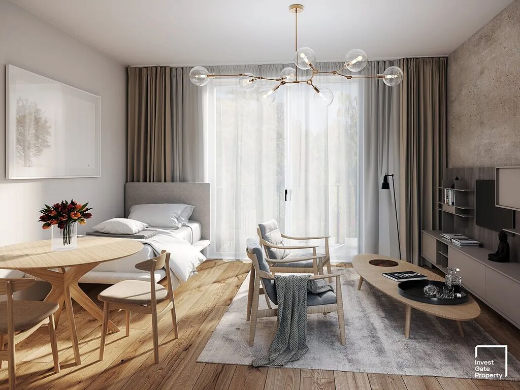Byt o dispozičním řešení 1+1, v prvním podlaží resortu, nabízí velkoryse pojatý obývací pokoj se vstupem na balkon a kuchyňským koutem, vstupní halu s prostorem pro úložné systémy a nadstandardně vybavenou koupelnu s toaletou. Všechny byty jsou vybaveny zařizovacími předměty vysokého standardu s možností volby z několika barevných dekorů.