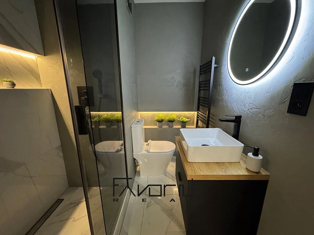 Koupelna je zděná. Je zde sprchový kout, nové obklady, dlažba, umyvadlo se skříňkou, baterie, podsvícené zrcadlo.