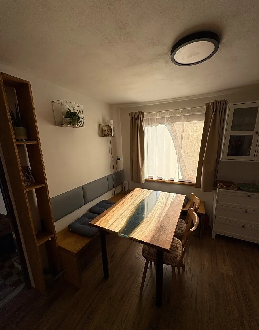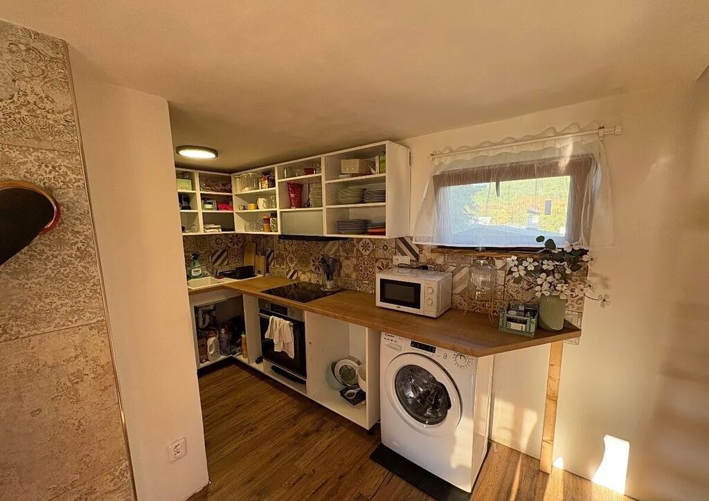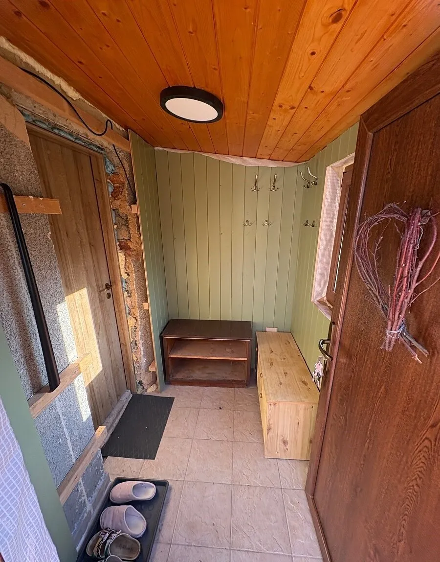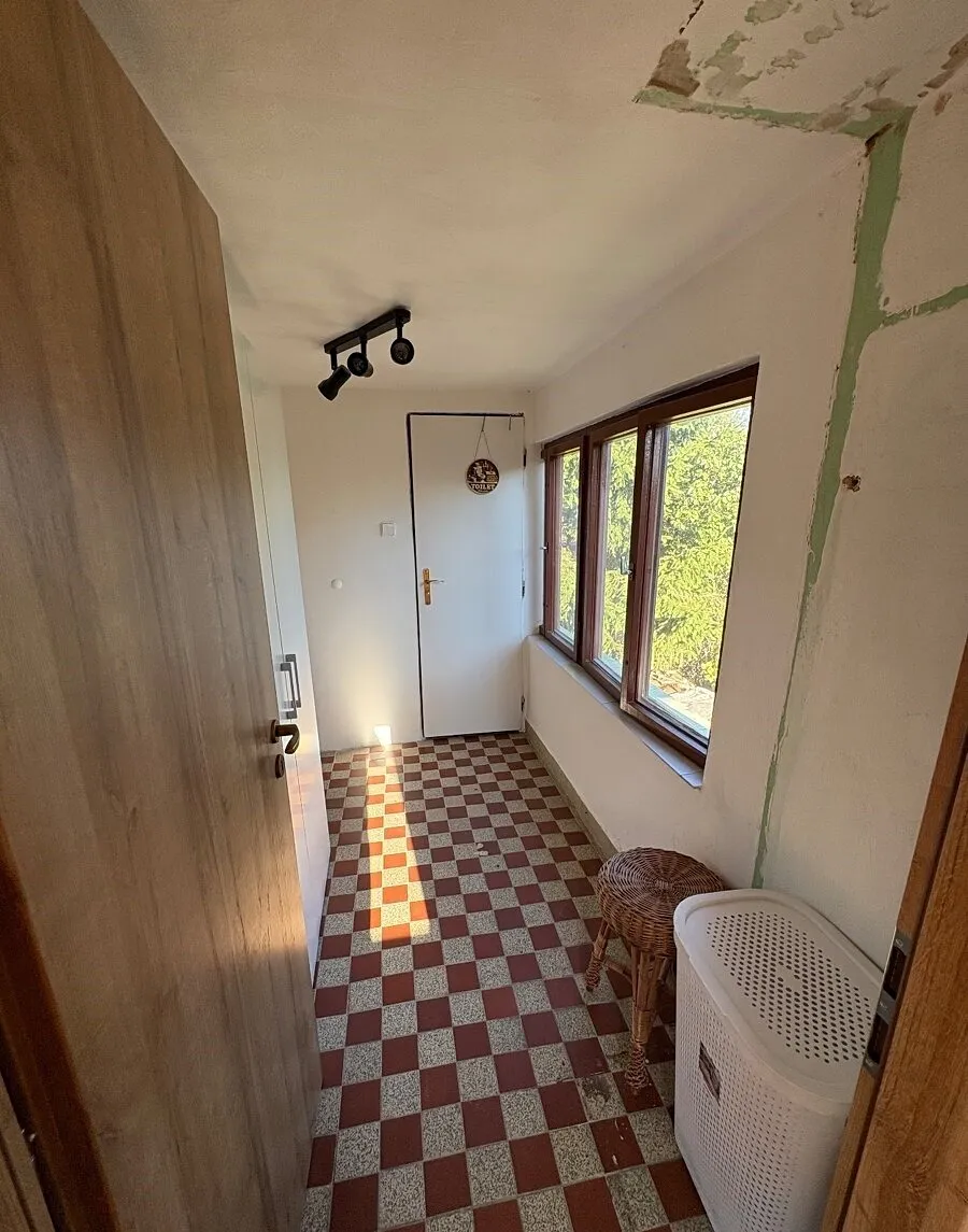 Dispozice domu - Nová příjezdová cesta, kde přes terasu dojdete k hlavním dveřím do předsíně, dále široká chodba se vstupem do koupelny s WC. Do dalších dveří z chodby je jídelna s dřevěnou lavicí, originálním stolem z epoxidu a odtud můžete koukat na nová kamna, kde příjemně hřeje oheň. Bez dveří je malý obývák s rozkládací sedačkou, např. pro návštěvy. Dům disponuje velkou kuchyní s novými spotřebiči a ekologickou pračkou. Po nových mlynářských schodech vstoupíte na chodbu s dveřmi do ložnice a dětského pokoje. Kromě dětského pokoje a chodby jsou všude nová okna.
