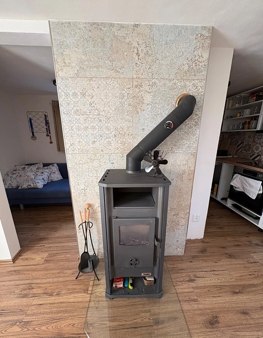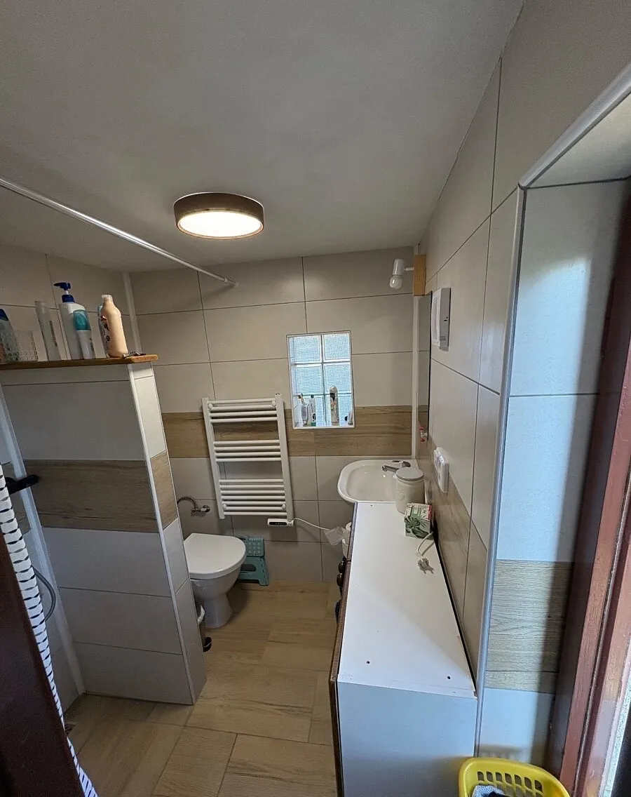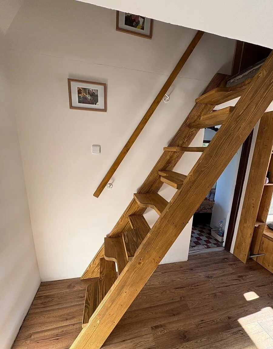 Dispozice domu - Nová příjezdová cesta, kde přes terasu dojdete k hlavním dveřím do předsíně, dále široká chodba se vstupem do koupelny s WC. Do dalších dveří z chodby je jídelna s dřevěnou lavicí, originálním stolem z epoxidu a odtud můžete koukat na nová kamna, kde příjemně hřeje oheň. Bez dveří je malý obývák s rozkládací sedačkou, např. pro návštěvy. Dům disponuje velkou kuchyní s novými spotřebiči a ekologickou pračkou. Po nových mlynářských schodech vstoupíte na chodbu s dveřmi do ložnice a dětského pokoje. Kromě dětského pokoje a chodby jsou všude nová okna.