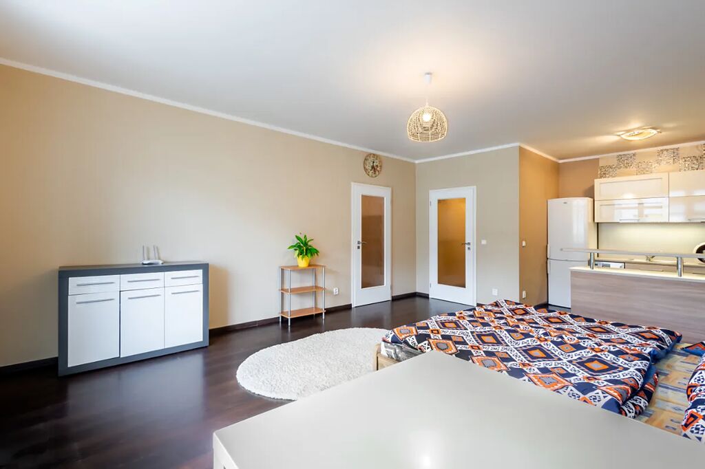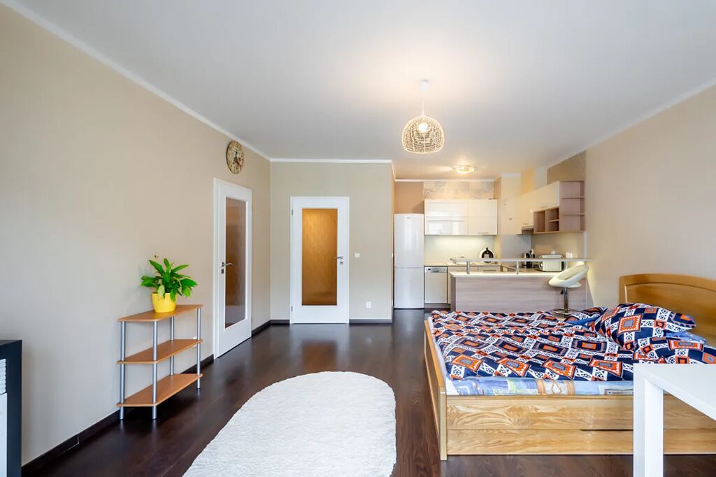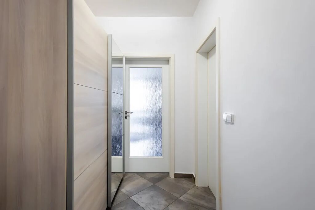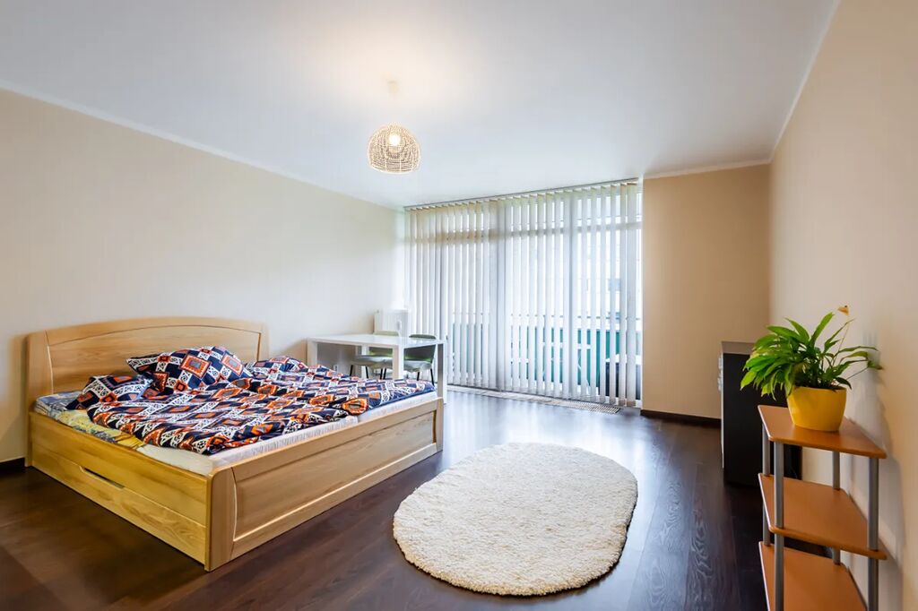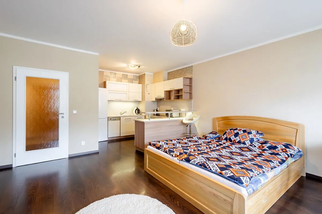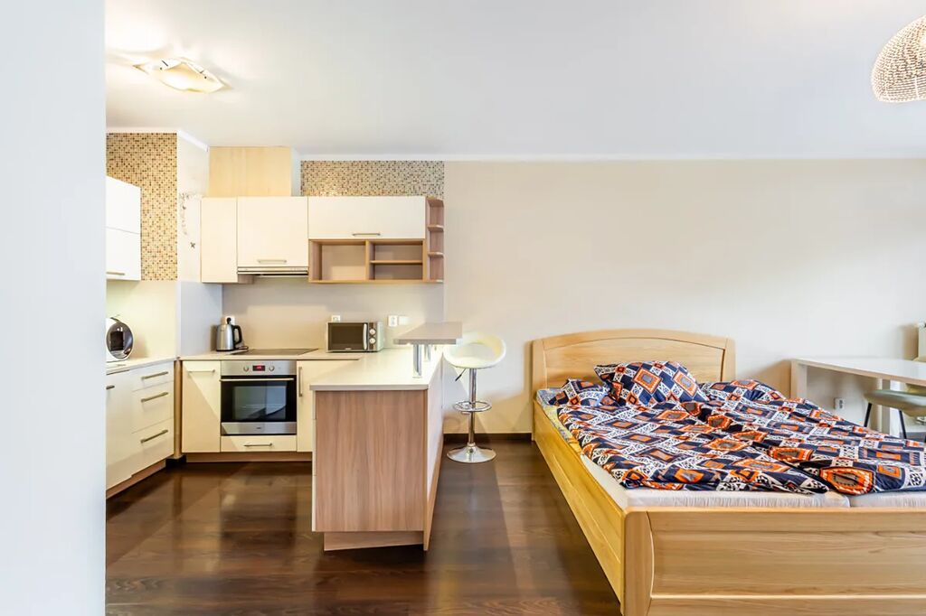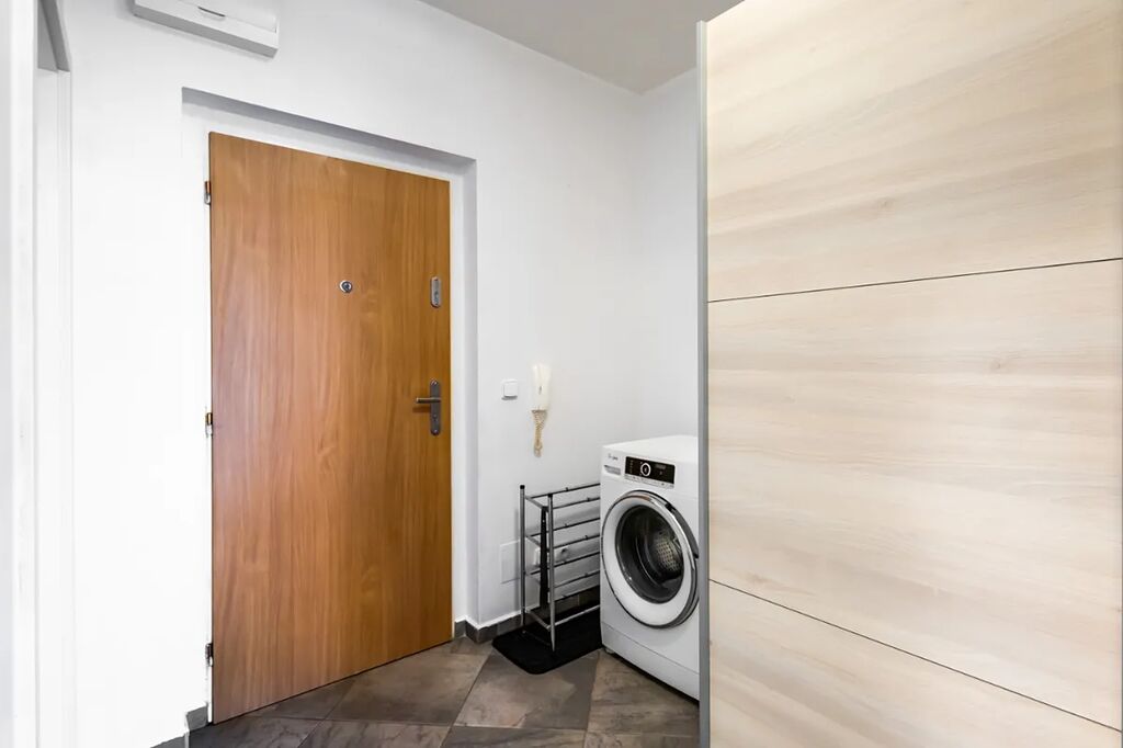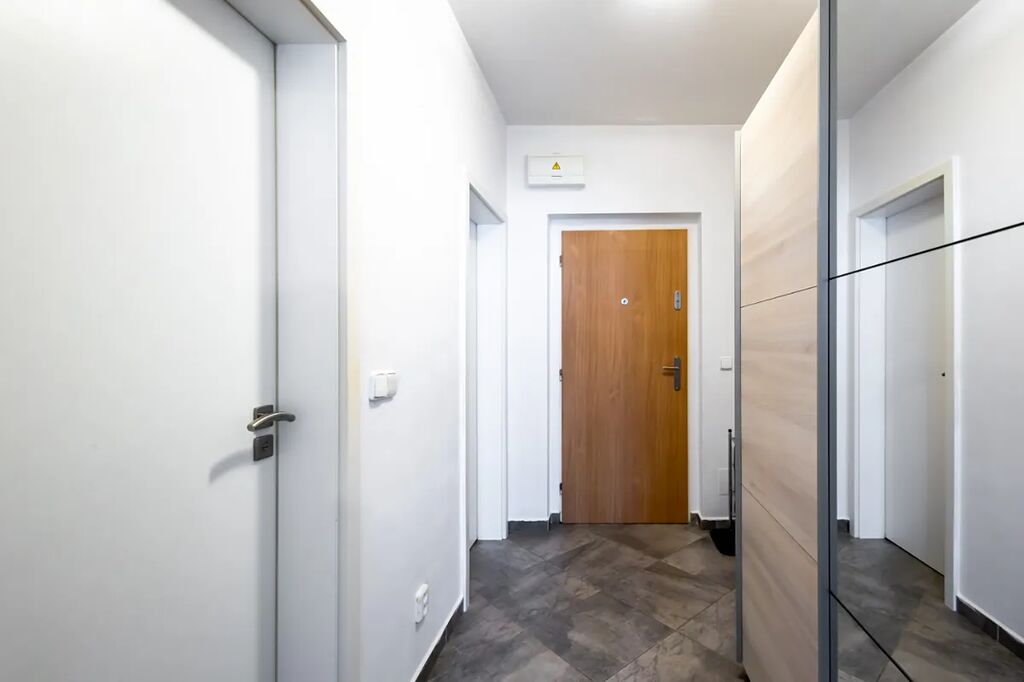 V bytě je velká předsíň s věšákovou stěnou a pračkou, koupelna s rohovou vanou a umyvadlem (otopný žebřík, skříňka, zrcadlo, ventilátor, místo pro pračku), samostatné WC s bidetovou sprchou a umyvadlem, útulná ložnice s vestavěnou skříní, pěkný obývací pokoj s jídelním koutem a moderní kuchyňskou linkou na míru. Kuchyň je plně vybavena elektrickými spotřebiči - el. trouba, myčka, sklokeramická varná deska, digestoř, vestavěná lednice s mrazákem, MW, kávovar, dřez). V pokoji stůl + 2 židle, skříňka. Z obývacího pokoje je vstup na balkon (stůl +2 židle, úložný box).