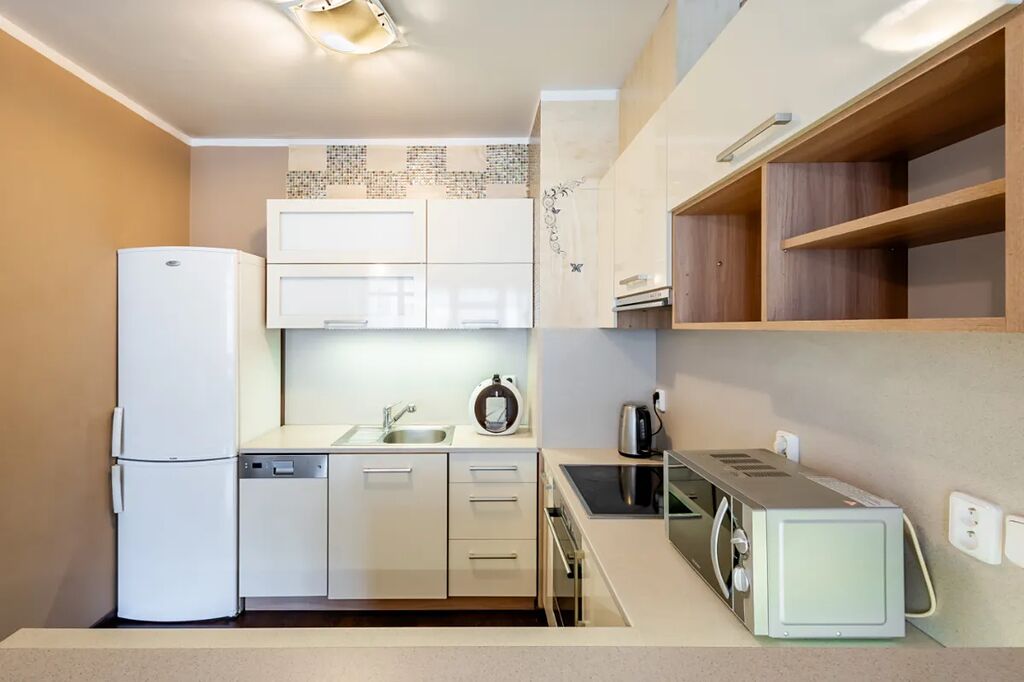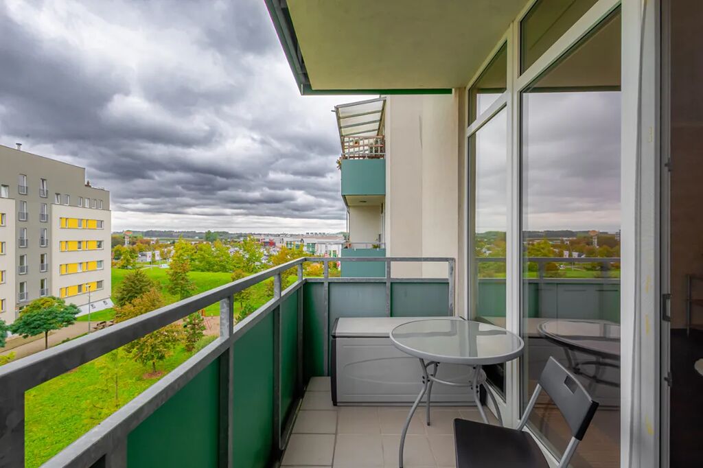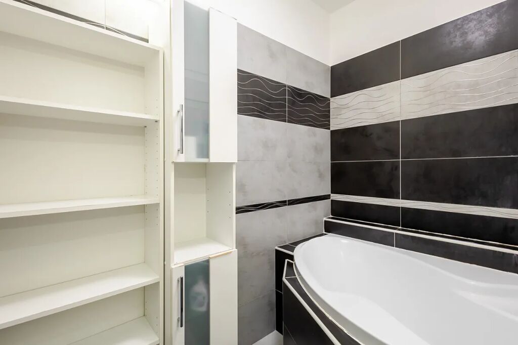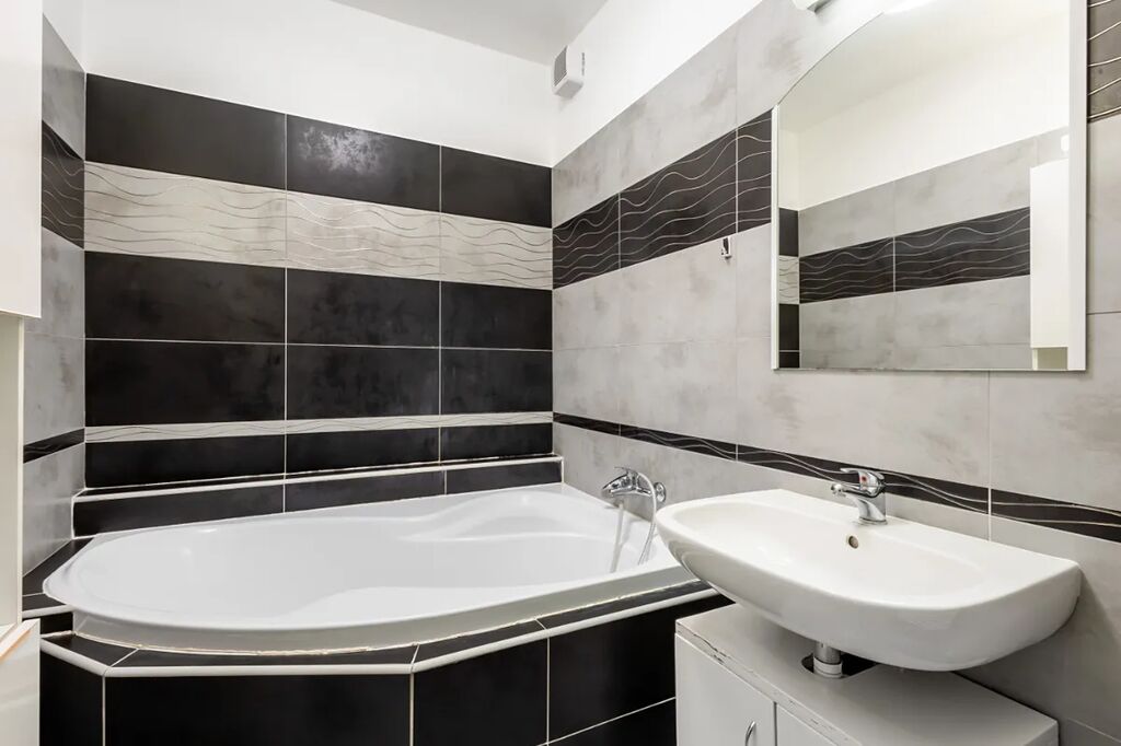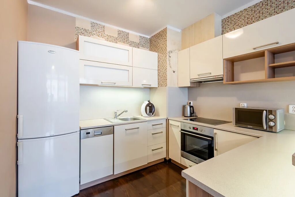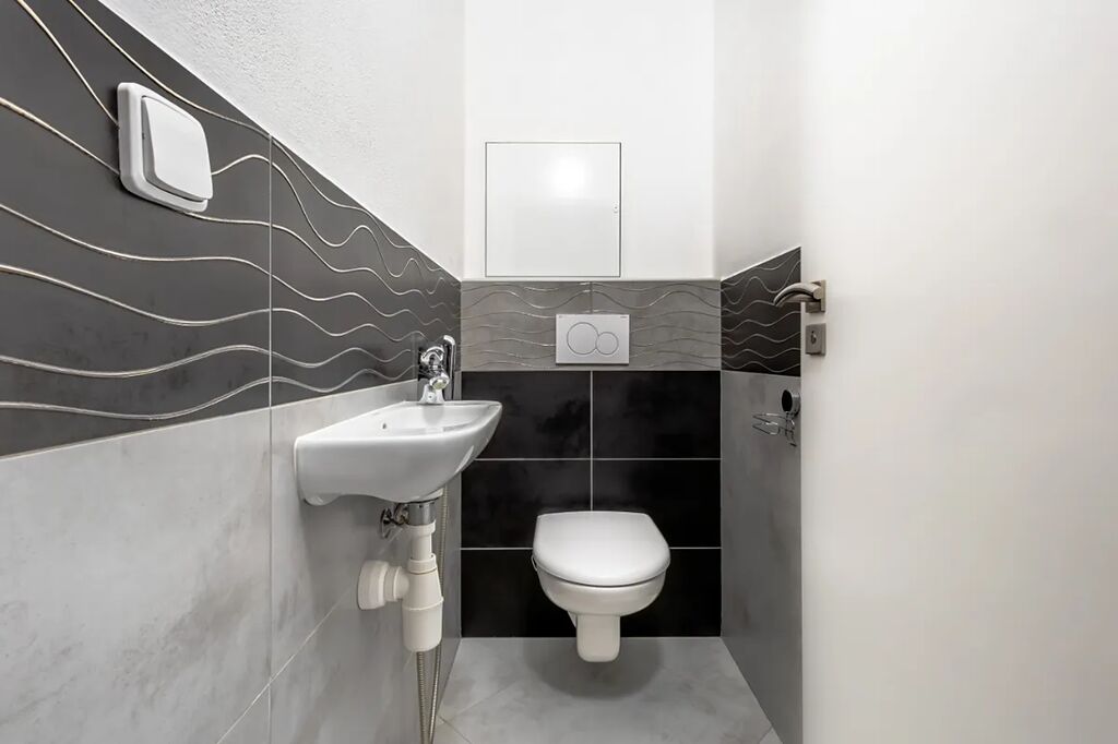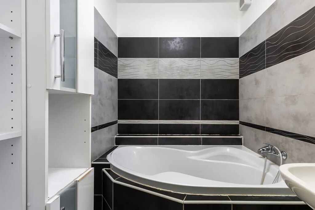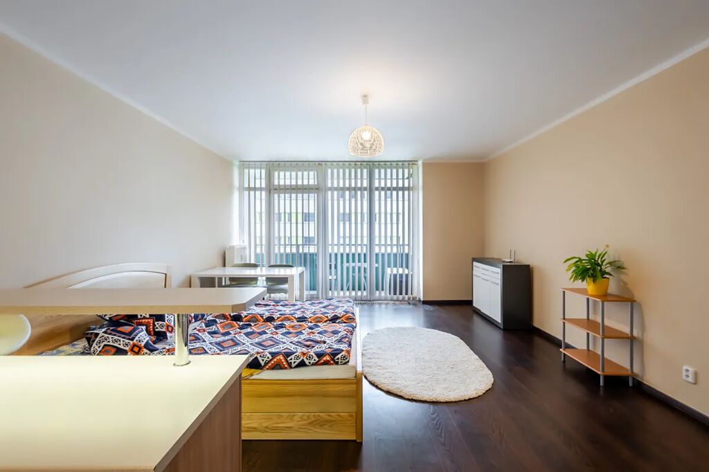 V bytě je velká předsíň s věšákovou stěnou a pračkou, koupelna s rohovou vanou a umyvadlem (otopný žebřík, skříňka, zrcadlo, ventilátor, místo pro pračku), samostatné WC s bidetovou sprchou a umyvadlem, útulná ložnice s vestavěnou skříní, pěkný obývací pokoj s jídelním koutem a moderní kuchyňskou linkou na míru. Kuchyň je plně vybavena elektrickými spotřebiči - el. trouba, myčka, sklokeramická varná deska, digestoř, vestavěná lednice s mrazákem, MW, kávovar, dřez). V pokoji stůl + 2 židle, skříňka. Z obývacího pokoje je vstup na balkon (stůl +2 židle, úložný box).