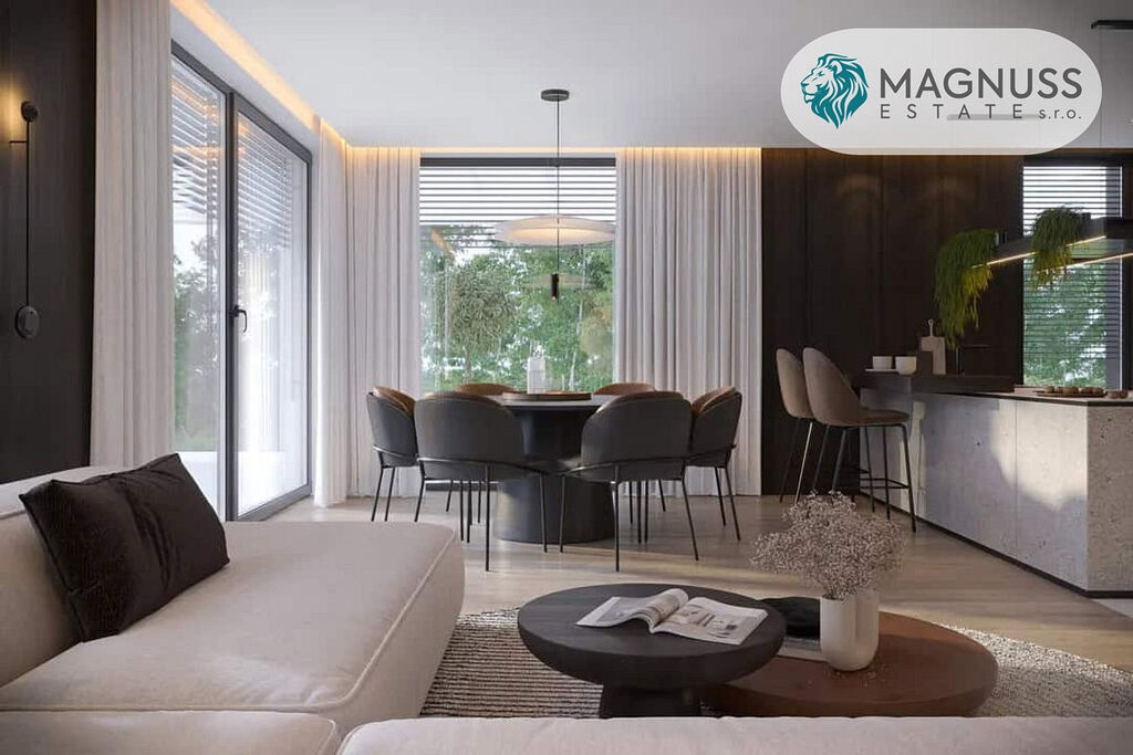 Velkoformátová okna spolu s otevřeným obývacím prostorem propojeným s kuchyní vytvářejí velkorysý, světlý interiér s přímým vstupem na terasu – ideální místo pro odpočinek nebo rodinná a přátelská setkání.