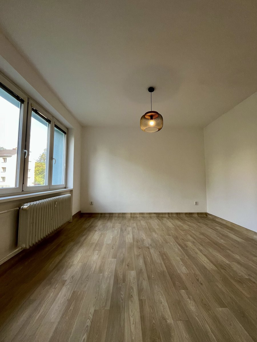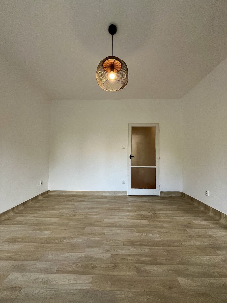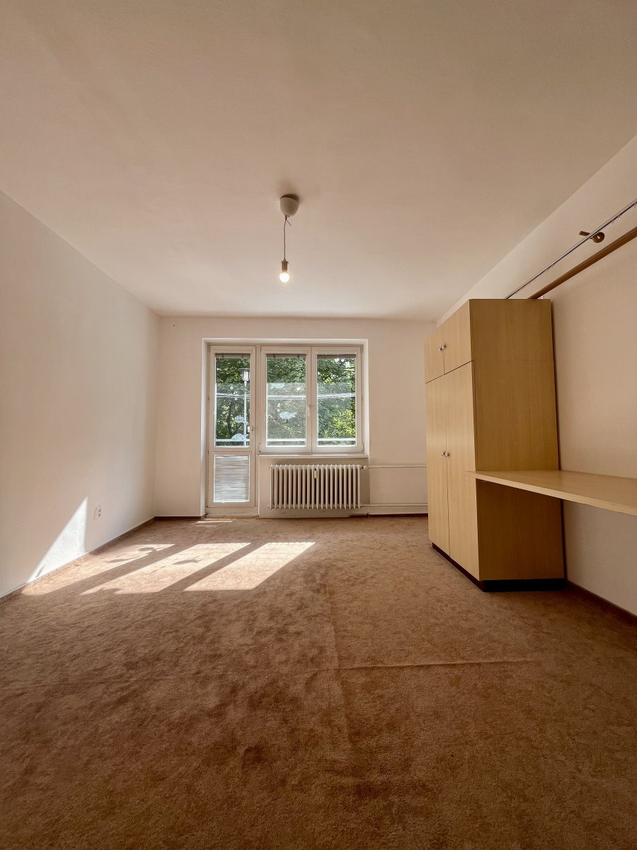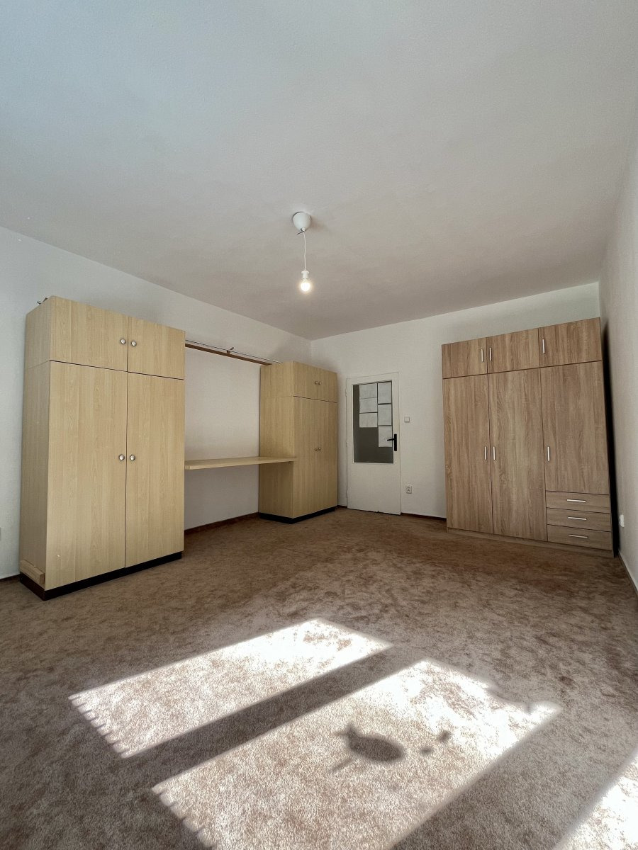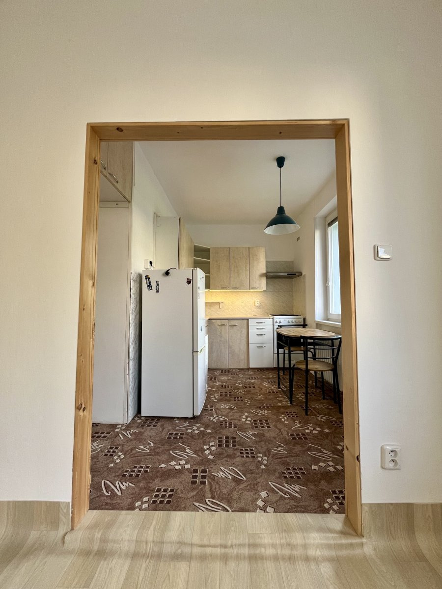 Byt se nabízí částečně vybavený. Nabízí 1 neprůchozí pokoj se šatní skříní a pracovním stolem. Druhý pokoj je spojen s kuchyní a stolkem s židlemi.