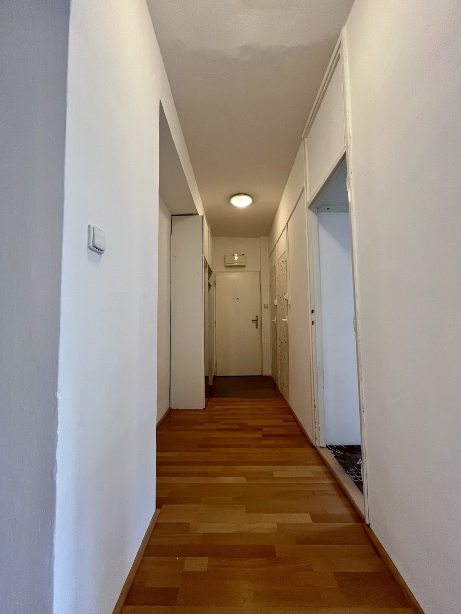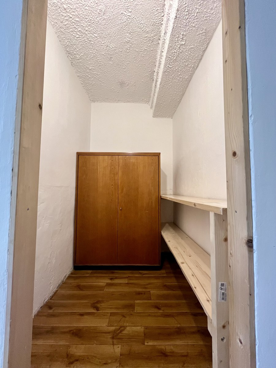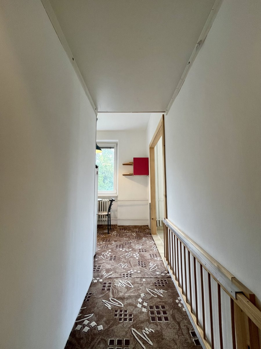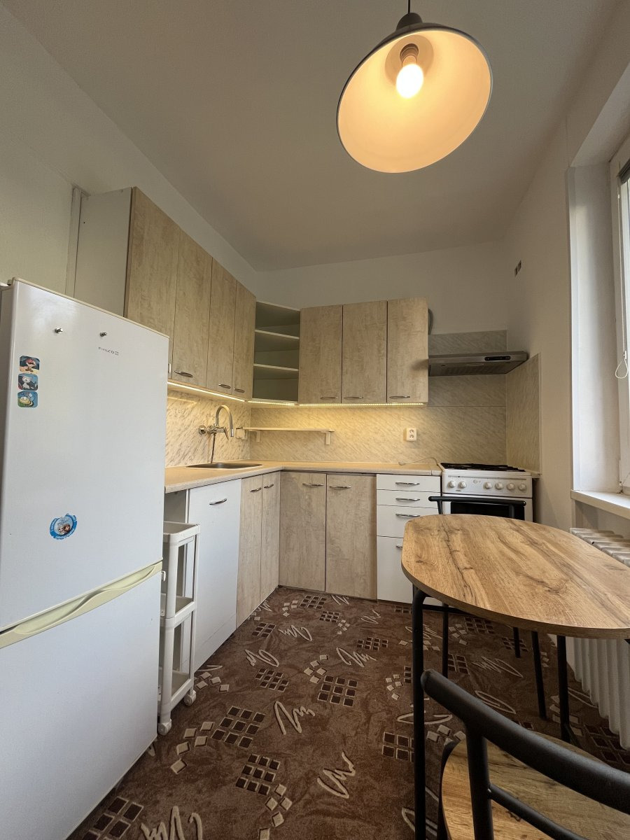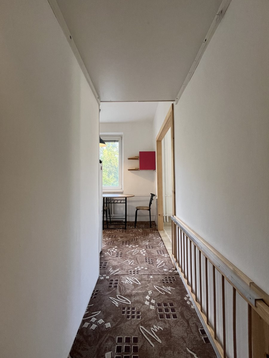 Byt se nabízí částečně vybavený. Nabízí 1 neprůchozí pokoj se šatní skříní a pracovním stolem. Druhý pokoj je spojen s kuchyní a stolkem s židlemi.