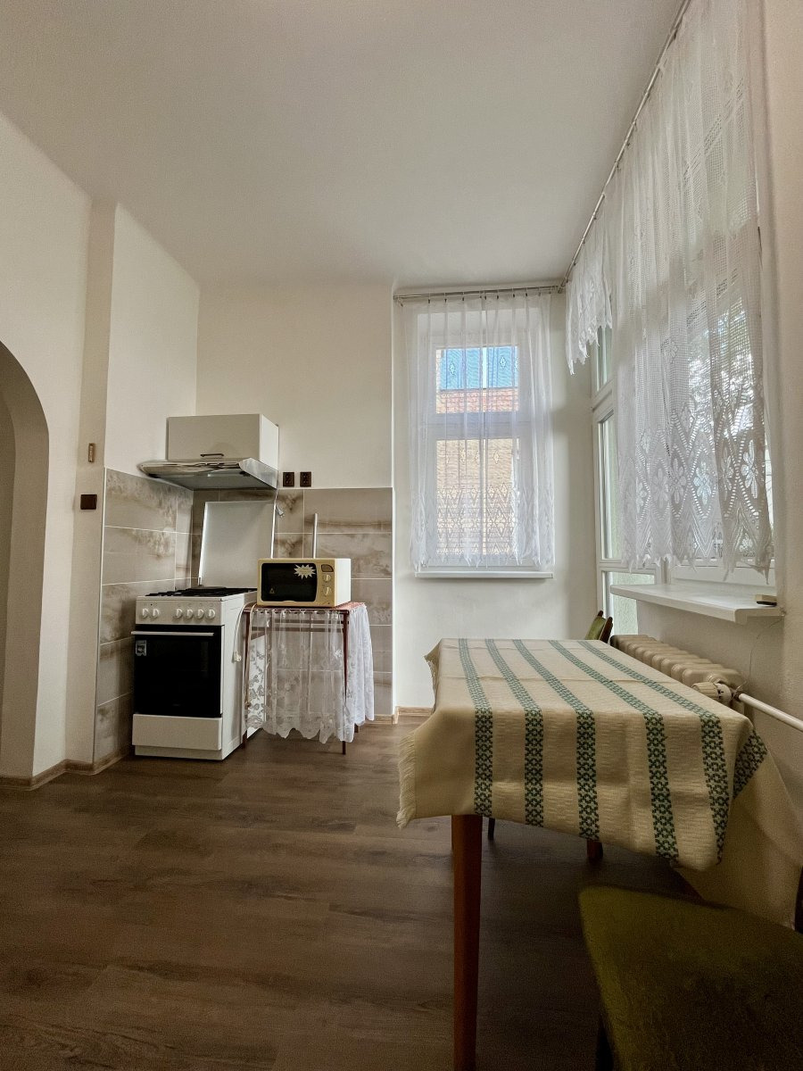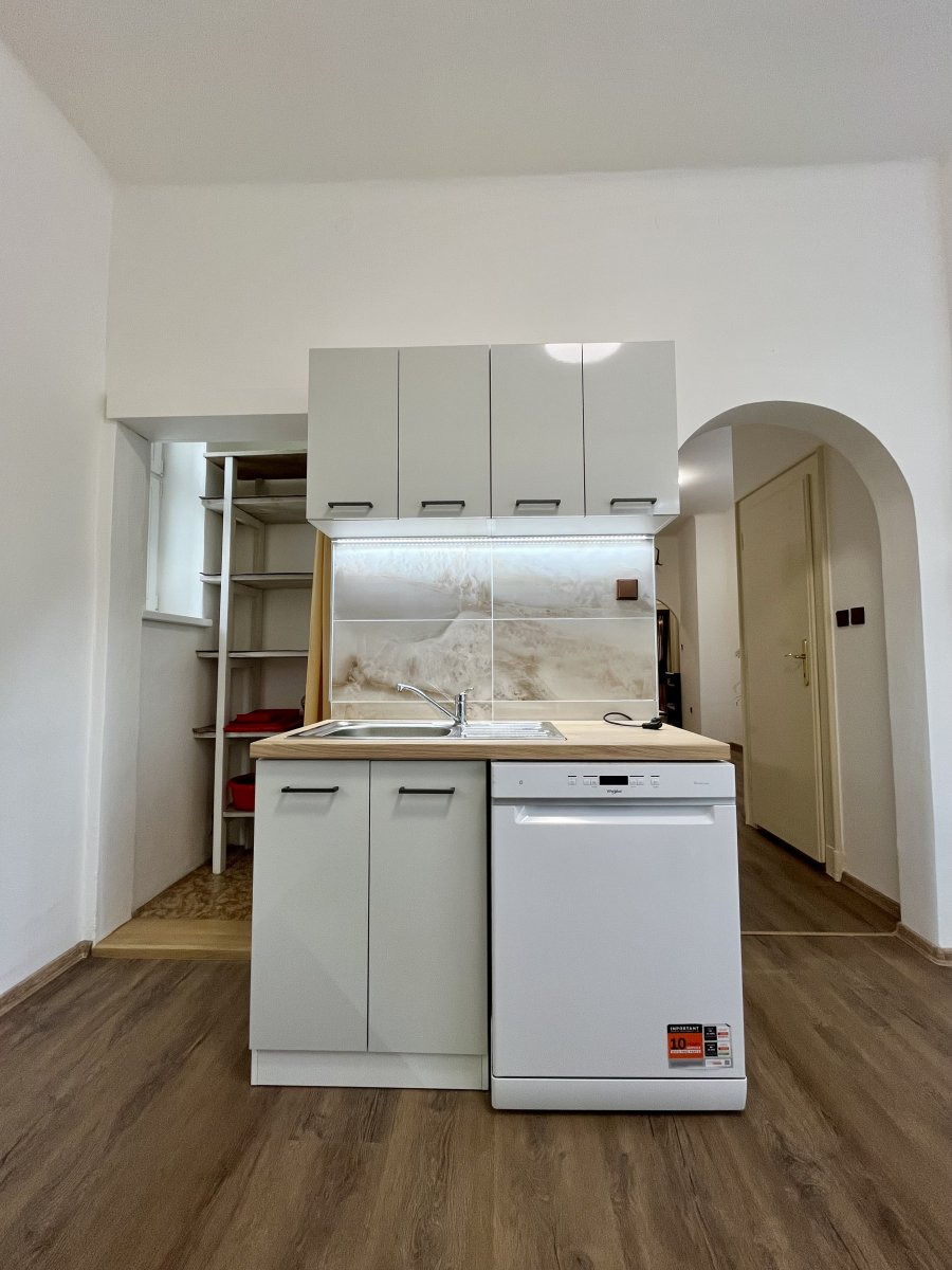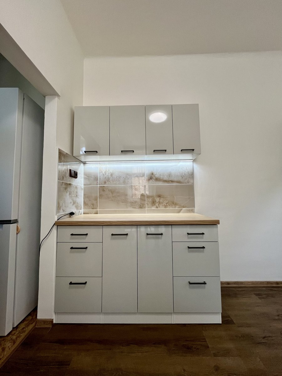 Z chodby míříme přímo do kuchyně, ve které najdeme elektrickou troubu, plynový sporák, myčku, digestoř a lednici. Jídelní stůl s židlemi. Byt je zrekonstruovaný, v oknech jsou žaluzie.
