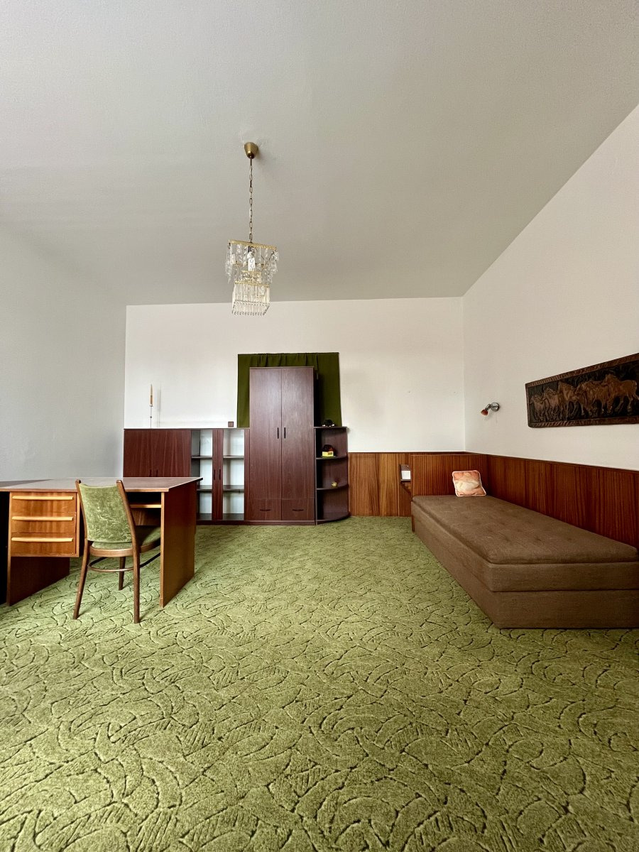 V jednom z neprůchozích pokojů najdeme kompletně vybavenou ložnici, od šatních skříní s manželskou postelí s rošty a matracemi, nočními stolky, osvětlením.