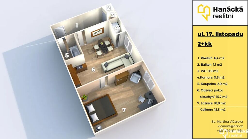 Prodej cihlového bytu 2+kk v Olomouci, ulice 17. listopadu. Jedná se o byt s výměrou 45,5 m2 + balkon a sklep, nacházející se ve 4. patře prvorepublikového cihlového domu bez výtahu. Byt má průchozí obývací pokoj s kuchyňským koutem, koupelna je s vanou, toaleta samostatná. Orientace bytu je do klidného dvorního traktu, okna plastová. Byt je v původním technickém stavu včetně vytápění, které je řešeno plynovými vafkami. K bytu dále patří malý balkón 1,1 m2 a sklep o výměře 3 m2. Za domem je možné využívat velký travnatý dvůr k posezení a relaxaci. Měsíční náklady činí 2.630 Kč + elektřina a plyn. Svou polohou v blízkosti jak centra města, tak hlavního nádraží je byt vhodný nejen k vlastnímu bydlení, ale také jako zajímavá investice k následnému pronájmu. Volný je ihned, prodeji nebrání žádná právní překážka. Další informace Vám rád sdělí makléř HRK.