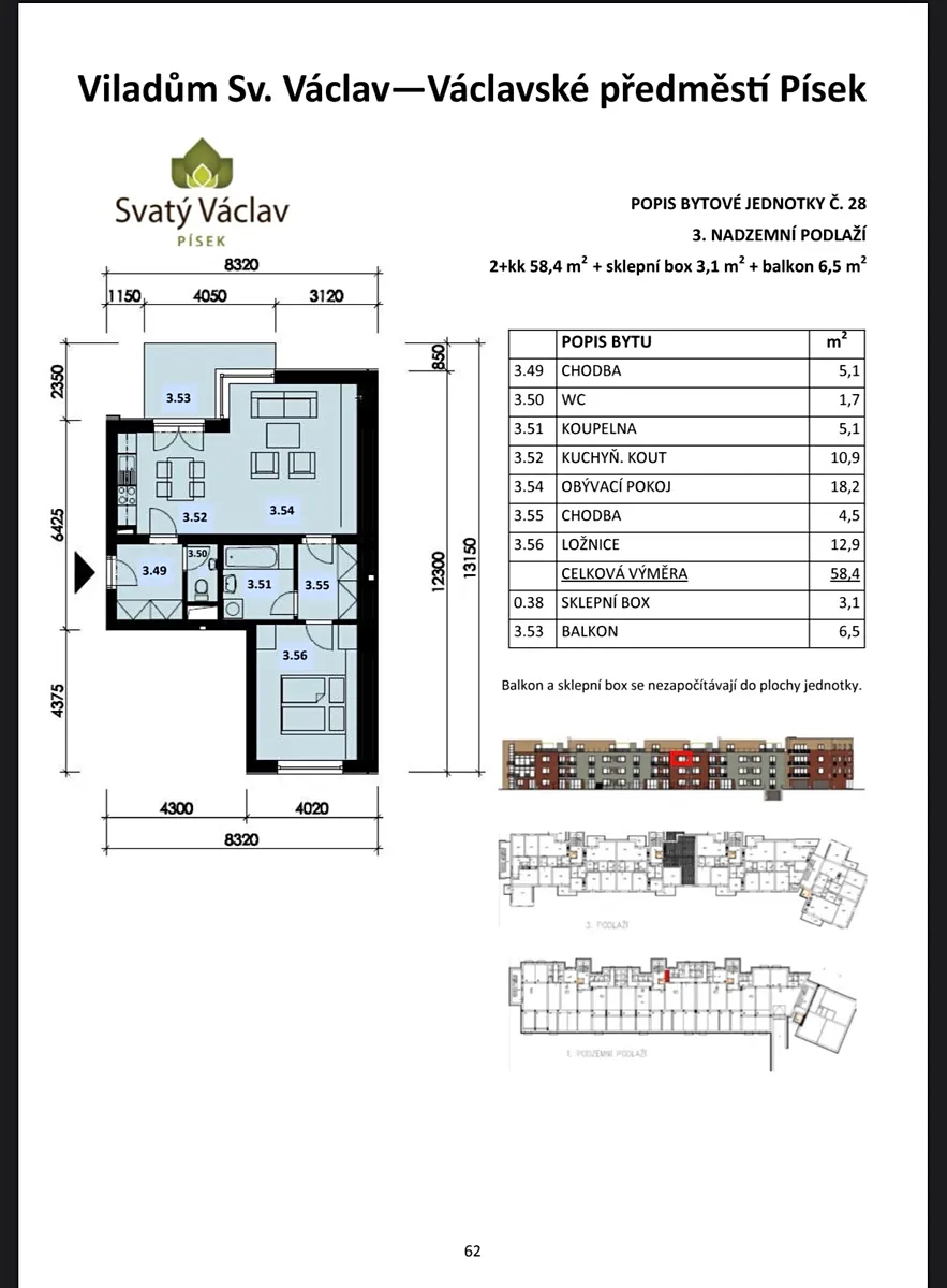 Moderní byt 2+kk s balkonem a sklepem v oblíbené rezidenční části Václavské předměstí v Písku. Byt o celkové ploše 65 m² se nachází ve 3. nadzemním podlaží cihlového domu s výtahem z roku 2017. Dispozici tvoří prostorný obývací pokoj s kuchyňským koutem a vstupem na východně orientovaný balkon, ložnice s walk-in šatnou, koupelna s vanou a umyvadlem, chodba s vestavěnými skříněmi a samostatná toaleta.Byt je vybaven kuchyňskou linkou se spotřebiči značky Gorenje (trouba, myčka, indukční deska, mikrovlnná trouba), vestavěnými skříněmi, plastovými okny s dvojsklem a laminátovými podlahami. Vytápění zajišťuje plynový kotel. Součástí je sklepní kóje, za příplatek 500 000 Kč garážové stání. Václavské předměstí patří k vyhledávaným lokalitám Písku. V okolí se nachází řeka Otava, sportoviště, dětská hřiště, školy, školky i veškerá občanská vybavenost. Do historického centra města je to jen několik minut chůze nebo pohodlně městskou dopravou.